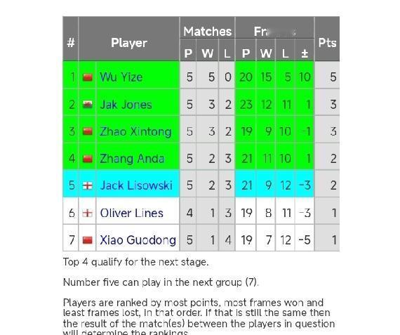 肖国栋 2-1 杰克·利索夫斯基 1月22日,斯诺克冠军联赛第六小组小组赛,肖国栋最后一个对手杰克利索夫斯基,此前,肖国栋1胜4负,小组积分垫底,出线前景岌岌可危。 前3局,肖国栋2-1杰克·利索夫斯基,本场获胜,肖国栋有机会晋级第7小组。
