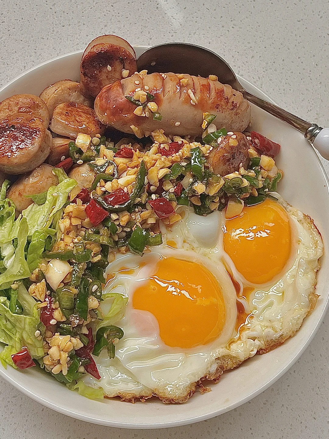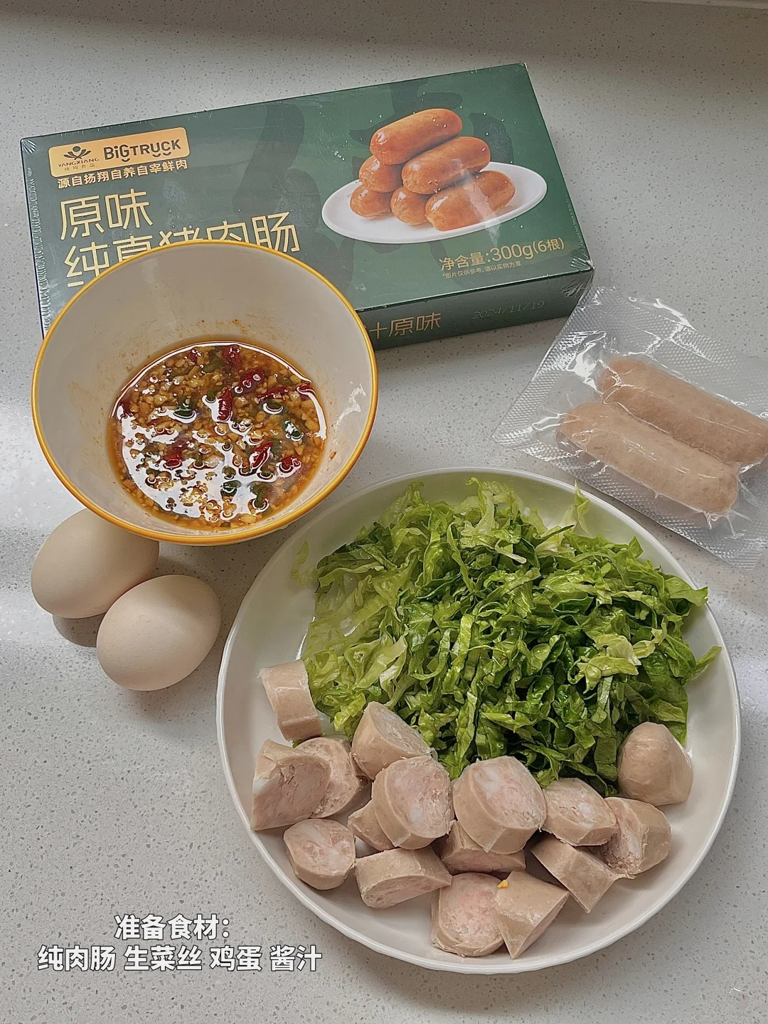 🥬食材:烤肠四根,两个鸡蛋,生菜,青红辣椒🌶️蒜末 白芝麻