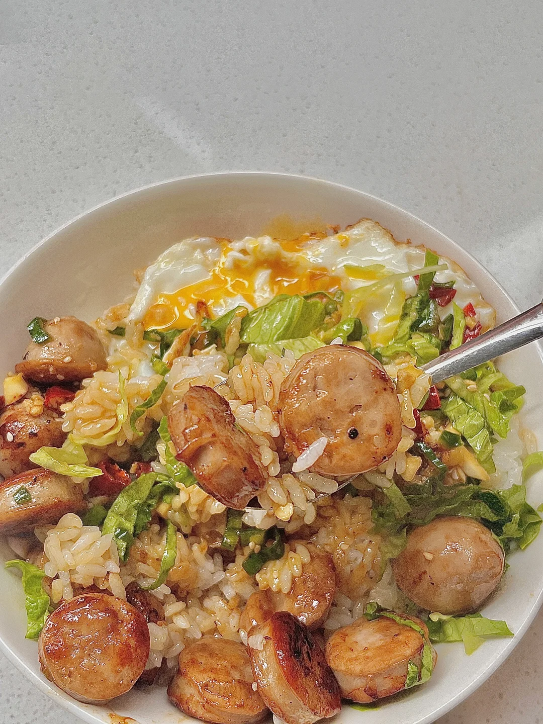 肉肠糖心蛋拌饭香晕了,放上焦香的烤肠 淋上酱汁一拌 饭张力直接拉满 每一口都超满足的,好吃又高蛋白的拌饭快去试试呀~