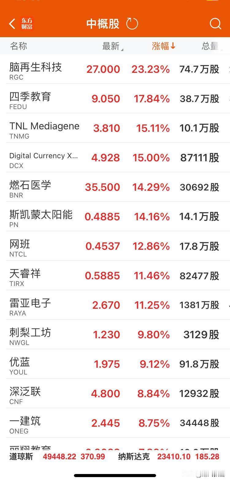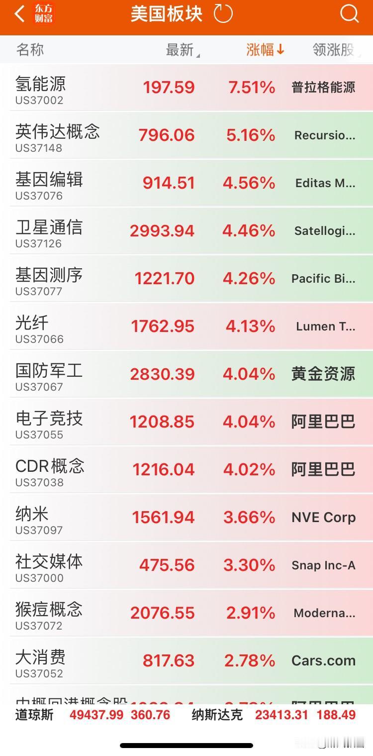 美市开盘一一齐涨,龙指数中阳 开盘1个小时数据。 第一、A目前独立行情,映射较小,但中概股上涨,为大A提供市场情绪,明天继续收阳概率加大。 第二、指数:美股三大指数集体走高,道指涨0.69%、纳指涨0.84%、标普500涨0.54%,纳斯达克中国金龙指数涨2.21%,中概股同步回暖。 板块:上涨居前为氢能源、英伟达概念、卫星通信、贵金属,大科技普涨。 下跌居前:婴幼儿产品、商业航天、玩具板块、存储→存储芯片[玫瑰]领跌,主因消费疲软或前期获利了结。 市场风险偏好回升,资金向科技、新能源方向 第三、中概股: 脑机接口→上涨23 %。 四季教育→上涨17.8 %