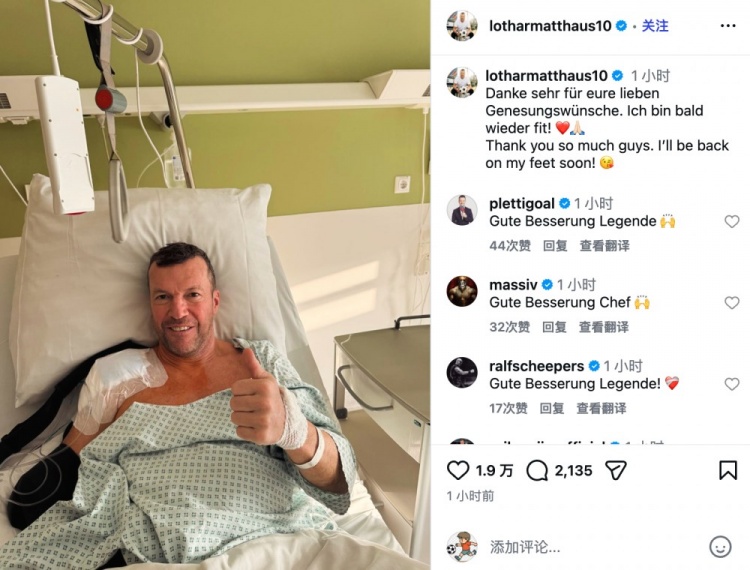 直播吧1月23日讯德国足坛名宿马特乌斯最近因滑雪受伤而接受手术,他在术后第一时间更新社媒晒照报平安。