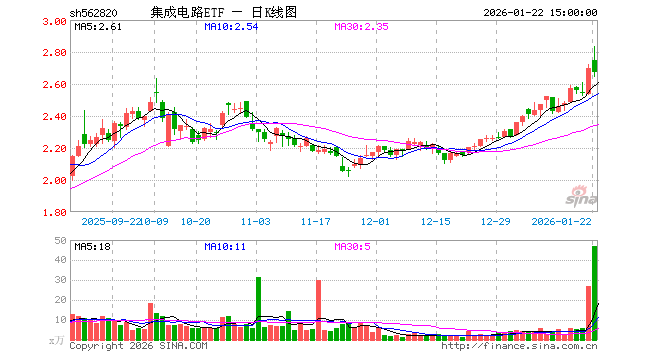 1月22日,集成电路ETF(562820)跌0.78%,成交额1.28亿元。当日份额增加2200.00万份,最新份额为9013.60万份,近20个交易日份额增加3600.00万份。最新资产净值计算值为2.41亿元。