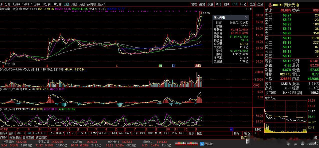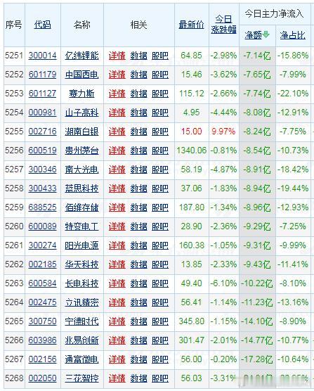 【财富晚茶】蛟龙携款逃逸:01.22收盘主力:资金净流出前20股票导语:作者系《网易号》优质财经领域创作者。曾经原创作者和知名网易号旅游领域创作者。大跨度行业等的写作,颇受网友喜爱。作品发表于2026.01.22.23:58 优雅端庄晚风。【内容概述】今日股市收评:主题是:【财富晚茶】蛟龙携款逃逸:01.22收盘主力:资金净流出前20股票。主旋律:今日主力资金:净流出前20股。蛟龙见顶劫款兑现:且战且退落袋为安。一、视野最新:资金涌出谁在杀跌600584 长电科技 300346 南大光电 000981 山子高科1、风险公司:高位杀跌第一、600584 长电科技靓丽底牌:全球封测市场第三、国内第一。话说K线:股价史高高位杀跌。股价短期见顶兑现。股价未来冲击新高。第二、300346 南大光电靓丽底牌:国内半导体材料领域的龙头企业。话说K线:股价史高高位回调。股价短期见顶杀跌。股价未来冲击新高。第三、000981 山子高科靓丽底牌:新能源汽车和半导体两大热门赛道真正“双龙头”。话说K线:股价史高高位回调。股价短期见顶杀跌。股价未来冲击新高。二、主力资金:谁在携筹兑现出逃1、002050 三花智控收盘价: 56.03元。涨跌幅: -3.31%。净流入: -24.31亿2、002156 通富微电收盘价: 56.00 元。涨跌幅: -0.20% 。净流入: -17.28亿3、603986 兆易创新收盘价: 301.47元。涨跌幅: -2.01%。净流入: -14.77亿4、300750 宁德时代收盘价:345.80 元。涨跌幅:-1.15% 。净流入: -14.10亿5、002475 立讯精密收盘价:56.41 元。涨跌幅:-1.14% 。净流入: -11.23亿6、600584 长电科技收盘价:49.40 元。涨跌幅:-6.10% 。净流入: -10.22亿7、002185 华天科技收盘价: 13.85元。涨跌幅: -2.33%。净流入: -9.43亿8、300274 阳光电源收盘价: 160.38元。涨跌幅:-1.05% 。净流入: -9.31亿9、600089 特变电工收盘价: 28.90 元。涨跌幅:-2.36% 。净流入: -9.29亿10、688525 佰维存储收盘价: 187.80元。涨跌幅:-1.34% 。净流入: -8.96亿11、300433 蓝思科技收盘价: 37.06元。涨跌幅: -1.83%。净流入: -8.94亿12、300346 南大光电收盘价: 58.19元。涨跌幅:-4.87% 。净流入: -8.91亿13、600519 贵州茅台收盘价:1340.06 元。涨跌幅: -0.81%。净流入: -8.54亿14、002716 湖南白银收盘价:15.00 元。涨跌幅: 9.97% 。净流入: -8.24亿15、000981 山子高科收盘价: 4.95 元。涨跌幅:-4.44% 。净流入: -8.08亿16、601127 赛力斯收盘价: 115.12元。涨跌幅: -2.66% 。净流入: -7.74亿17、601179 中国西电收盘价: 15.46元。涨跌幅: -3.62%。净流入: -7.65亿18、300014 亿纬锂能 收盘价: 64.85元。涨跌幅: -2.98% 。净流入: -7.14亿19、600036 招商银行收盘价:37.85 元。涨跌幅: -1.02%。净流入: -6.98亿20、300450 先导智能 收盘价:57.40 元。涨跌幅: -2.56%。净流入: -6.88亿三、视野背景:短中长期调仓换股追击杀跌:原形毕露:2026年1月22日收盘时,半导体封测、输变电、锂电池等板块出现下跌,主要受到以下利空因素的综合影响:1、资金政策:双面杀手第一、资金获利回吐监管资金获利回吐与监管风险:近期锂矿板块因前期涨幅过大,遭遇资金集中获利回吐,叠加交易所加强风控措施,导致市场情绪降温,碳酸锂期货价格大幅下跌,对锂电池相关板块形成压力。第二、风格切换流动变化市场风格:切换与流动性预期变化。当前市场:风格正从高估值的成长赛道向低估值的“稳增长”板块切换。预期谨慎:投资者对流动性预期趋于谨慎。导致前期:热门的半导体、新能源等板块面临估值回调压力。第三、资金板块明显分流短期资金面压力:尽管全市场成交额维持在万亿以上(1月22日达2.69万亿元),但资金在板块间出现明显分流,部分资金从高位板块流出,转向其他相对低位或政策支持的领域,加剧了相关板块的调整。第四、集体回调细分机会值得注意:尽管当日板块集体回调,但部分细分领域仍存结构性机会。例如,通富微电等半导体封测龙头企业因受益于AI及存储需求增长、产能利用率提升及业绩超预期,其长期基本面并未受损。四、本创作品:优质财金网易作者投资投机迷茫之中:给予尽可能有帮助:资本市场风险自负。(优雅端庄晚风《网易号》财经领域创作者和原创作者 违者必究)
