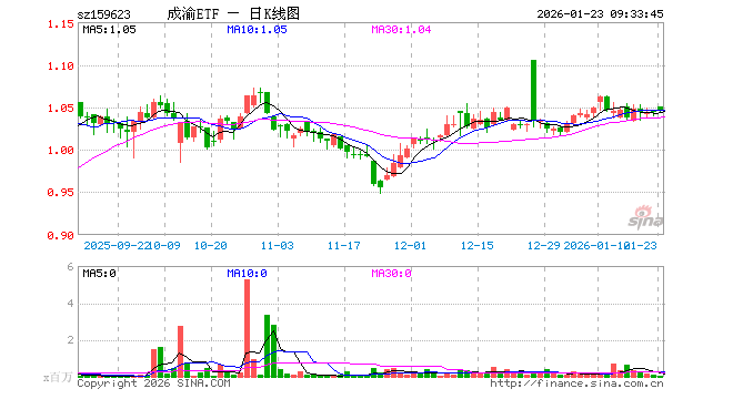 1月23日,成渝经济圈ETF(159623)开盘涨0.48%,报1.050元。成渝经济圈ETF(159623)重仓股方面,新易盛开盘跌0.94%,五粮液涨0.04%,赛力斯跌0.06%,泸州老窖涨0.00%,长安汽车涨0.00%,巨人网络涨0.93%,成都银行跌0.13%,渝农商行涨0.16%,四川长虹涨0.09%,科伦药业涨0.00%。