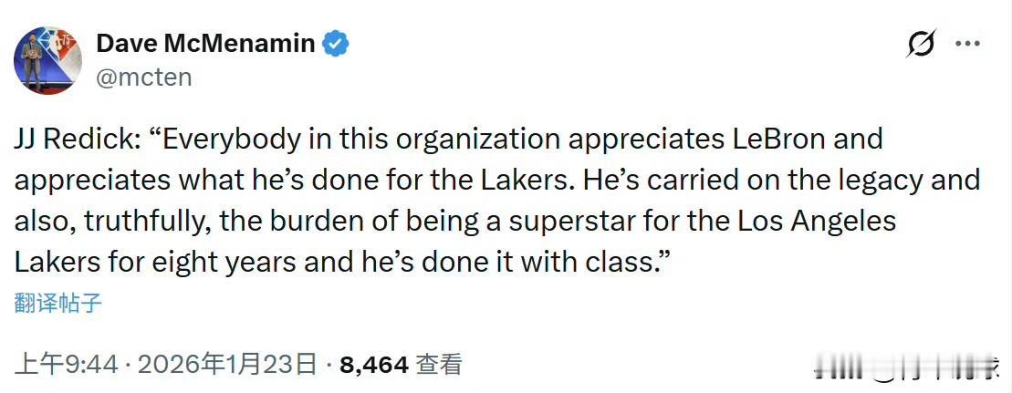 雷迪克说了句公道话啊! 今天,湖人队将客场挑战快船队。赛前,主教练雷迪克接受了媒体采访,谈到了有关珍妮-巴斯和詹姆斯的传闻,他说道:“整个湖人队组织都很感激詹姆斯,谢谢他为湖人所做的一切,他传承了球队的辉煌,8年来承担了作为球队超级巨星的重任,他做得非常出色。” 雷迪克无疑说了一句公道话,詹姆斯的到来拯救了当时陷入低谷的湖人队,让这支球队和这座城市重新充满了活力。浓眉也是因为他才愿意被交易至湖人,两人携手拿下了队史第17座总冠军,这是湖人队史的历史性时刻,雷迪克说的话一点都不为过,整个湖人队都需要感谢詹姆斯的付出。自从珍妮-巴斯与詹姆斯的不和传闻被曝光以后,包括珍妮-巴斯本人、雷迪克、考辛斯、阿里纳斯、格林,甚至死对头A-史密斯都公开站出来为其鸣不平,詹姆斯对湖人队的贡献是不可泯灭的。