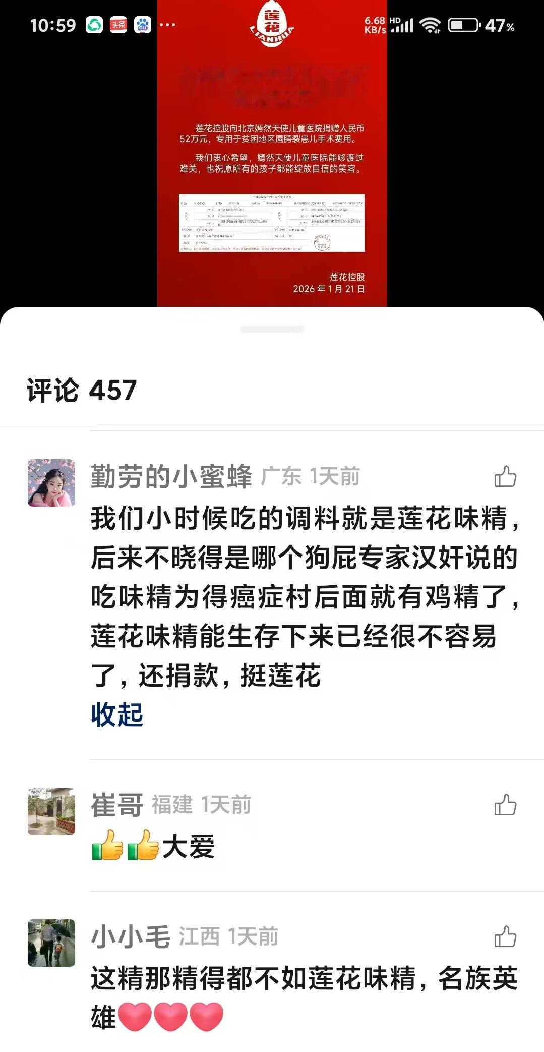 莲花味精向嫣然天使儿童医院捐款52万元,此前曾传破产,“只剩办公楼”,网友称:又现一鸿星尔克