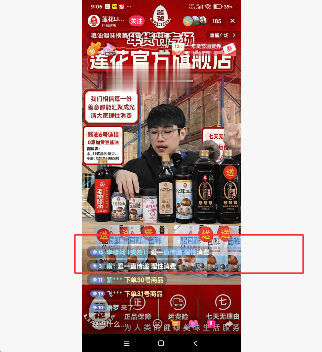 22号早上8点,中国食品安全网进入到莲花味精在抖音、视频号不同平台的不同直播间,看到直播间“理性消费”的留言频繁闪现,这让人不禁想起2021年鸿星尔克在净利润亏损2.2亿元的情况下,毅然向河南灾区捐款5000万元,引发网友“野性消费”,公司总裁吴荣照不得不在直播间连用四个“理性”呼吁消费者冷静下单的场景。