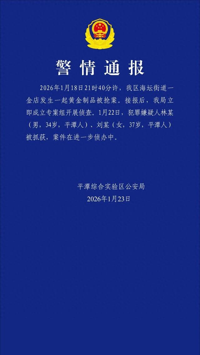 中国网1月23日讯福建省平潭综合实验区公安局1月23日发布警情通报称,1月18日21时40分许,该区海坛街道一金店发生一起黄金制品被抢案。
