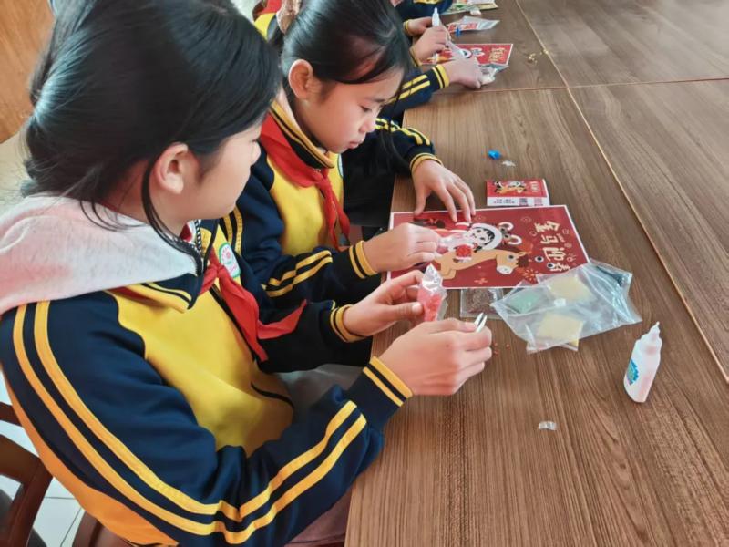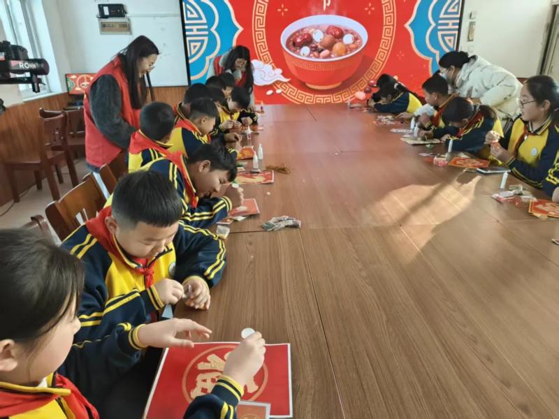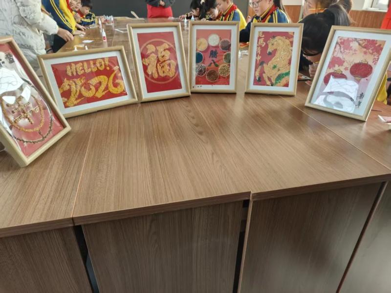 “五谷画,是用各类植物种子拼贴而成的传统工艺美术形式,被列入非物质文化遗产名录。它承载着中华民族对丰收的祈愿和对美好生活的向往……”活动现场,志愿者们提前备好小米、红豆、绿豆等各色杂粮,以及卡纸、胶水、画笔等工具,通过生动的故事讲解,向孩子们普及腊八节的起源传说、民间习俗及五谷文化的深厚底蕴,着重阐述了五谷画这一非遗技艺的传承意义与艺术价值。讲解结束后,志愿者们手把手指导学生创作,从构图设计、色彩搭配到杂粮粘贴,耐心解答每一个疑问。孩子们充分发挥想象力,小心翼翼地勾勒轮廓、细致粘贴杂粮,将对新年的美好期许与对传统文化的热爱融入每一件作品。在动手实践中,孩子们不仅领略了非遗技艺的独特魅力,还在对杂粮的合理运用中,深化了节约粮食、珍惜劳动成果的意识。