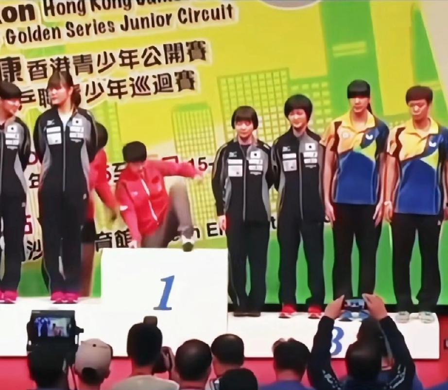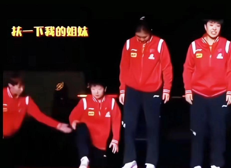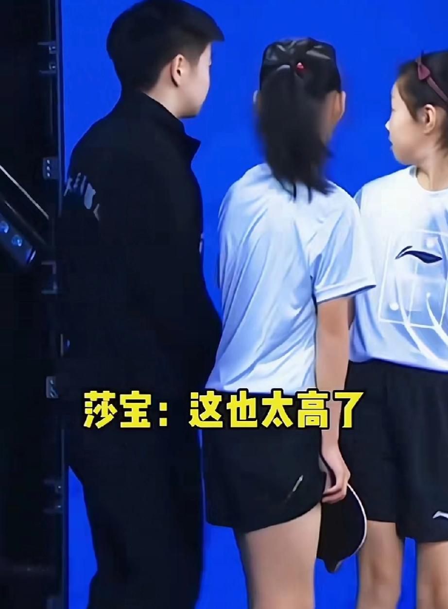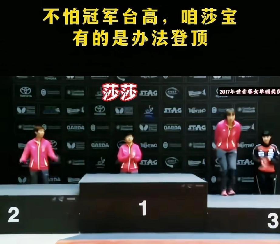 莎莎搞笑得一幕,现在看太温暖了。 图一,青涩的莎莎冠军领奖台都到莎莎腰部了,看着那么高的领奖台,莎莎手脚并用的上去。 图二,莎莎左右看看,再看看高高的领奖台,瞬间心头一计,我走一圈,从亚军讲台上去。 图三,陈梦轻松的上了领奖台,莎莎一脚上去,旁边鳗鱼赶紧夹住她的胳膊,有姐姐就是好办事。 图四,莎莎、陈梦代表深圳大学参加活动和小朋友合影,站在边边的莎莎,被前排的孩子身高惊住了,这都到我嘴巴边了,我得赶紧挪挪去中间去。 真是个小机灵鬼啊!