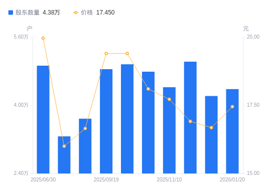 日期A股户数(户)流通A股户均持股数(股)户均持股市值(万元)2026-01-20437945868.8010.242026-01-09421756094.0910.162025-11-28502485114.998.652025-11-10442395809.7610.292025-10-31478975366.069.712025-09-30496285178.8910.052025-09-19484625303.5010.292025-08-29368626972.4411.612025-07-31327207855.0812.572025-06-30492935214.0910.41