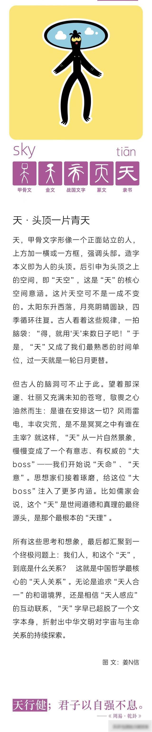 天,甲骨文字形像一个正面站立的人,上方加一横或一方框,强调头部。造字本义即为人的头顶。后引申为头顶之上的空间,即“天空”,这是“天”的核心空间意涵。这片天空可不是一成不变的。太阳东升西落,月亮阴晴圆缺,四季循环往复。古人看着这些规律,一拍脑袋:“得,就用'天'来数日子吧!”于是,“天”又成了我们最熟悉的时间单位,过一天就是一轮日月更替。