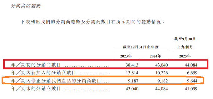 数据显示,尽管沃客非凡分销商数量在增长,但每年退出的分销商数量超20%。2023年年初,公司分销商数量为38413个,当年退出的分销商有9187个,占年初数量的23.92%。2024年年初,公司分销商数量为43040个,当年退出的数量为9182个,占比21.33%。2025年年初,公司分销商数量为44084个,2025年前三季度退出的有9644个,占比21.88%。