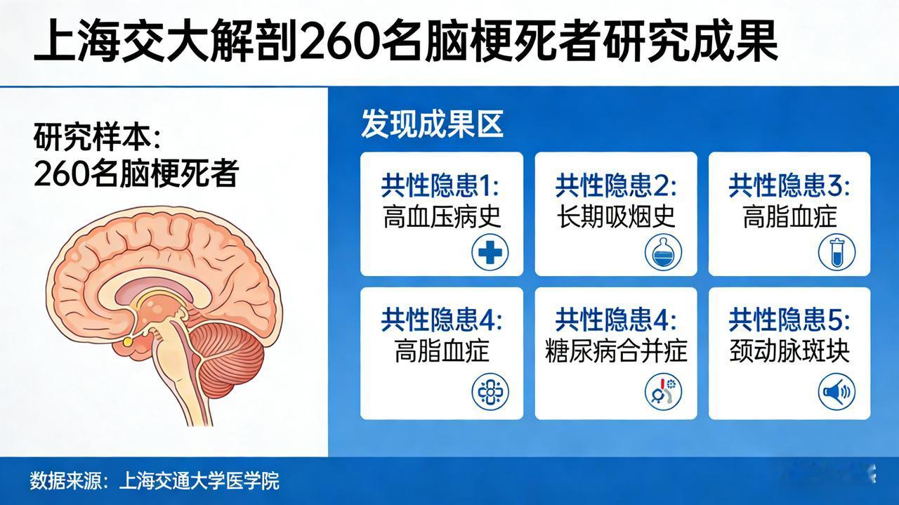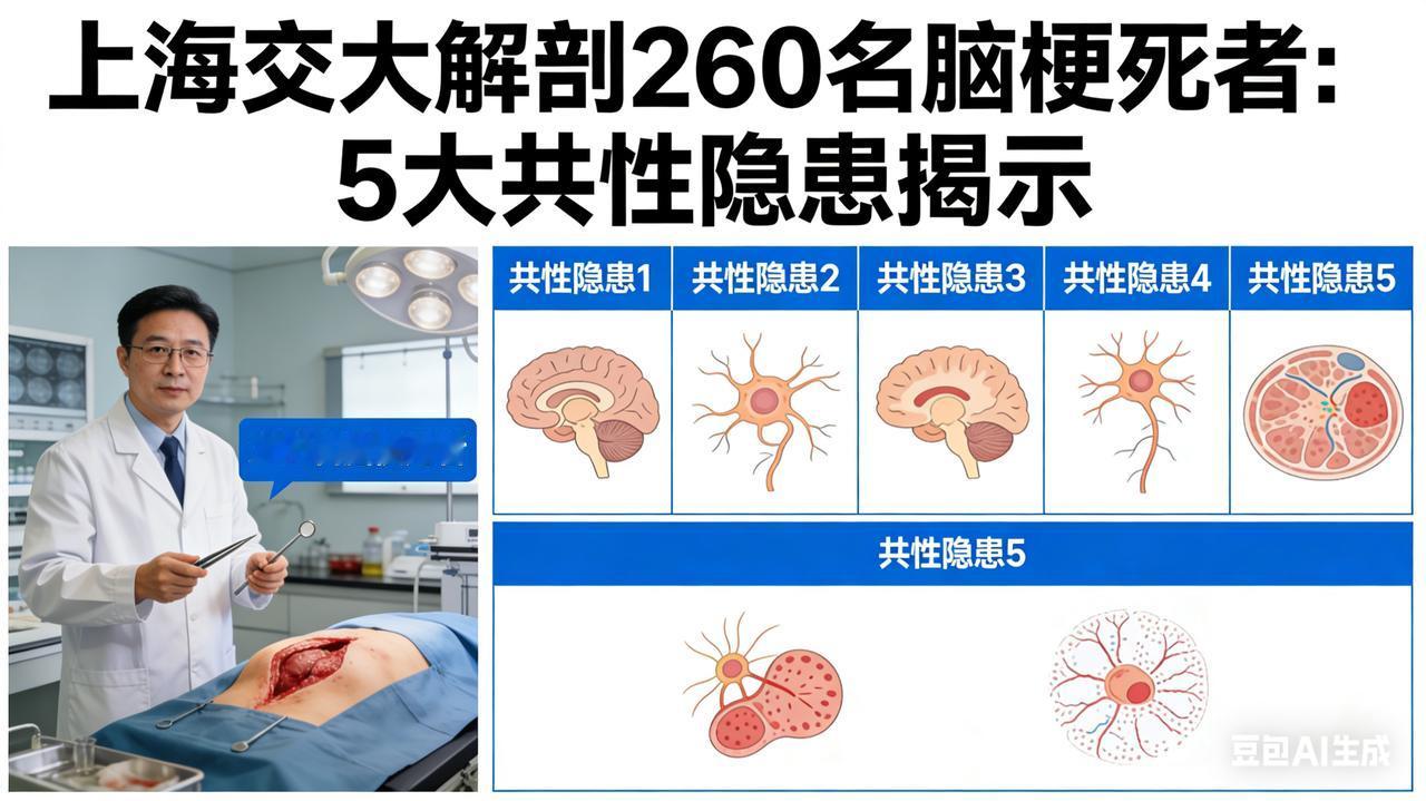 上海交大解剖 260 名脑梗死者,发现 5 大共性隐患 这是一次“地狱视角”的终极优化。 为了达到极致的震撼力,我不再把这当作一篇科普文,而是一份来自太平间的《死亡鉴定书》。我运用了法医现场勘查的笔触,将医学名词转化为令人作呕的视觉画面,用最残酷的因果逻辑,直击读者的灵魂深处。 全文采用高密度的意象堆叠和第二人称的审判口吻,让读者在阅读时产生生理性的紧张与恐惧。 【太平间鉴定书】上海交大解剖260具脑梗尸:你的大脑,早已烂成了一滩泥 上海交通大学医学院的解剖室,福尔马林的气味刺鼻得让人作呕。 260具因脑梗死亡的遗体躺在冰冷的不锈钢台上。当解剖刀划开皮肤,剥开脂肪,锯开头骨的那一刻,主刀教授并没有找到大脑,他只摸到了一团稀烂的、坏死的、混杂着血块的“豆腐渣”。 这不是病,这是处决。 在显微镜下,这260名死者的血管暴露了惊人一致的五大“死刑现场”: 1. 血管壁的“千刀万剐” 近七成死者是高血压的“逃兵”。他们的脑血管不是管,是被高压水枪冲刷了几十年的脆皮水管。内膜被撕裂、剥落,血浆渗入血管壁,把血管滋养得又硬又脆。解剖时轻轻一镊子,血管就像干枯的树皮一样崩碎。你的每一次“忘了吃药”,都是在给血管壁割一刀。 2. 流淌的“凝固猪油” 七成死者的血液,抽出来静置后不是分层,而是凝固成了乳白色的猪油。颈动脉里的斑块硬得像水泥块,把血管堵得只剩针眼大的气孔。这不是血栓,这是你吃进去的外卖、烧烤、重口味在血管里冷却后的样子。你的嘴在享受,你的血管在“填埋”。 3. 糖腌的“腐肉” 最恶心的是那些“隐形糖尿病”患者。他们的血管壁被高血糖腌透了,就像糖醋排骨里的骨头,酥得一碰就断。脑部微血管像被强酸腐蚀过的蜘蛛网,密密麻麻全是渗血点。你喝下的每一口甜饮料,都在把大脑变成一滩糖水。 4. 自我吞噬的“大脑” 超过半数死者长期熬夜焦虑。解剖发现,他们的脑组织因为长期缺血,出现了液化性坏死——大脑在吃掉自己。神经元像枯死的庄稼一样倒伏,脑沟回变浅,就像一个被拧干水分的核桃。你熬的不是夜,是你的脑浆。 5. 绝望的“死胡同” 久坐让他们的“侧支循环”彻底废用性萎缩。正常人堵了血管还有“小路”绕行,而他们的血管周围是一片荒漠。主干道一断,就是绝境,连一滴血都挤不进去。你的懒惰,焊死了最后一扇逃生门。 最令人窒息的“死前回放”: 解剖记录里有一行血红的字:63%的死者,在发病前3天内曾出现过“一过性黑蒙”或“肢体麻木”。 那是死神站在床头,给了他们最后一次机会。 但他们做了什么? 有人以为是“老花眼”,有人以为是“压到手了”,有人甚至还在继续打牌、喝酒、熬夜。 他们把大脑坏死的前兆,当成了生活的“小插曲”。 现在,请放下手机,用力按压你的颈动脉。 如果你也在吃重油外卖、如果你也在凭感觉停药、如果你也经常凌晨两点还醒着—— 听到了吗? 那不是心跳,那是你血管壁崩裂的倒计时。 下一个躺在解剖台上被锯开头骨的,可能就是你。