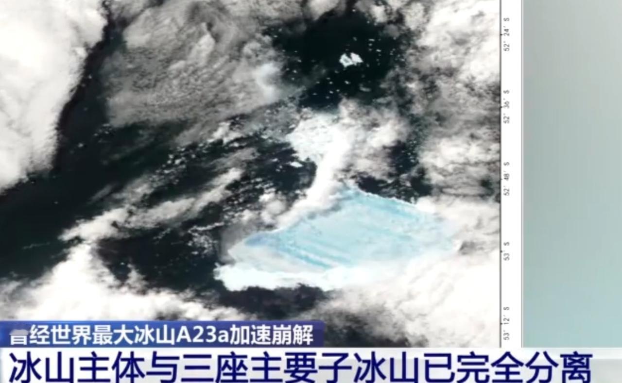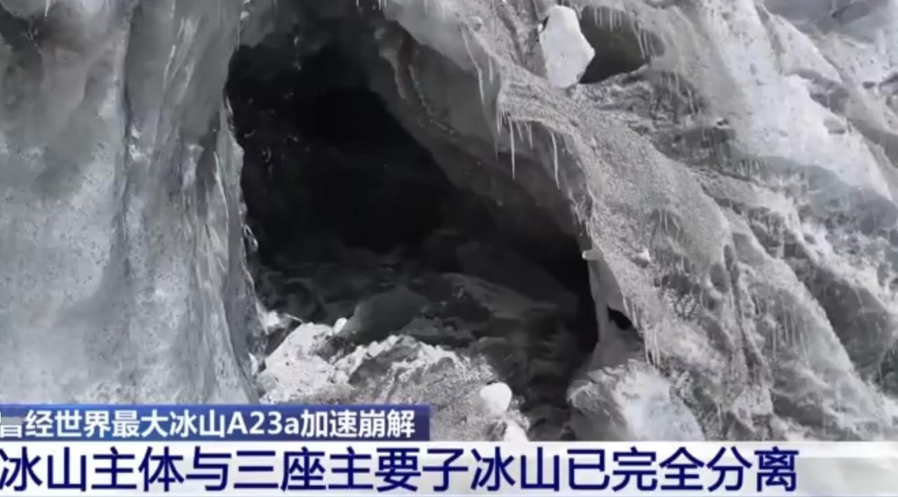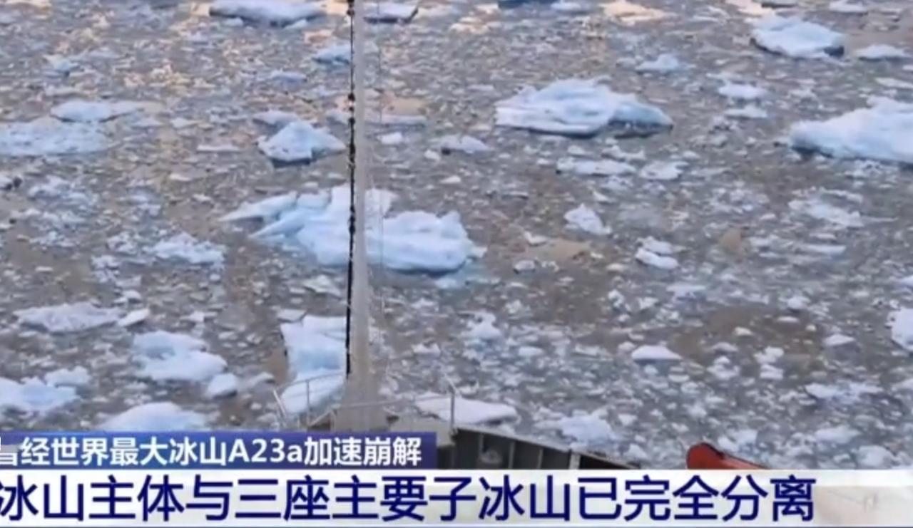 曾经世界最大冰山A23a正加速崩解,主体已与三座主要子冰山完全分离,或将在未来几周内彻底消失。卫星影像与科考画面清晰记录下这一过程:冰川融水沿裂缝下渗冲刷,拓宽裂隙并让底部变薄,加速了冰体的不稳定性。雪龙号科考船正航行在冰面之上,见证着这场气候危机下的冰川消亡,也在为人类探索冰封极地、记录地球变化留下珍贵数据。