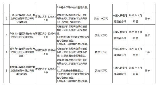 1月23日金融一线消息,中国人民银行福建省分行行政处罚决定信息公示表(闽银罚决字〔2026〕1—5号)显示,福建沙县农村商业银行股份有限公司因存在以下违法违规行为:违反账户管理规定;违反收单业务管理规定;违反数据安全管理规定;违反金融统计规定,未按规定报送统计报表;未按规定报送大额交易报告或可疑交易报告;与身份不明的客户进行交易,被警告并处以罚款264万元。