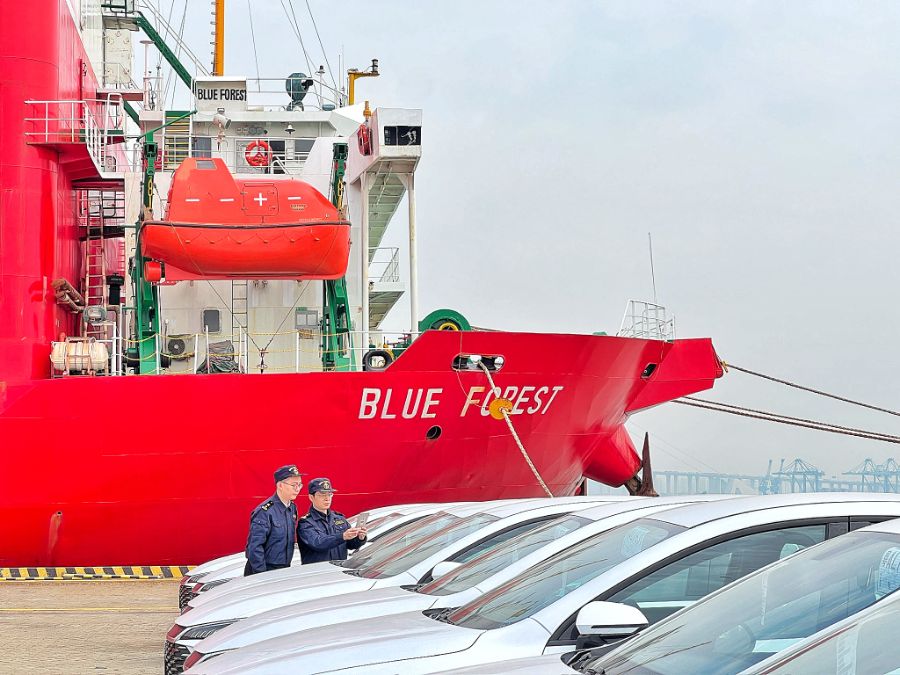 (海关关员在南沙汽车码头对即将出口的国产汽车进行监管,广州海关供图)