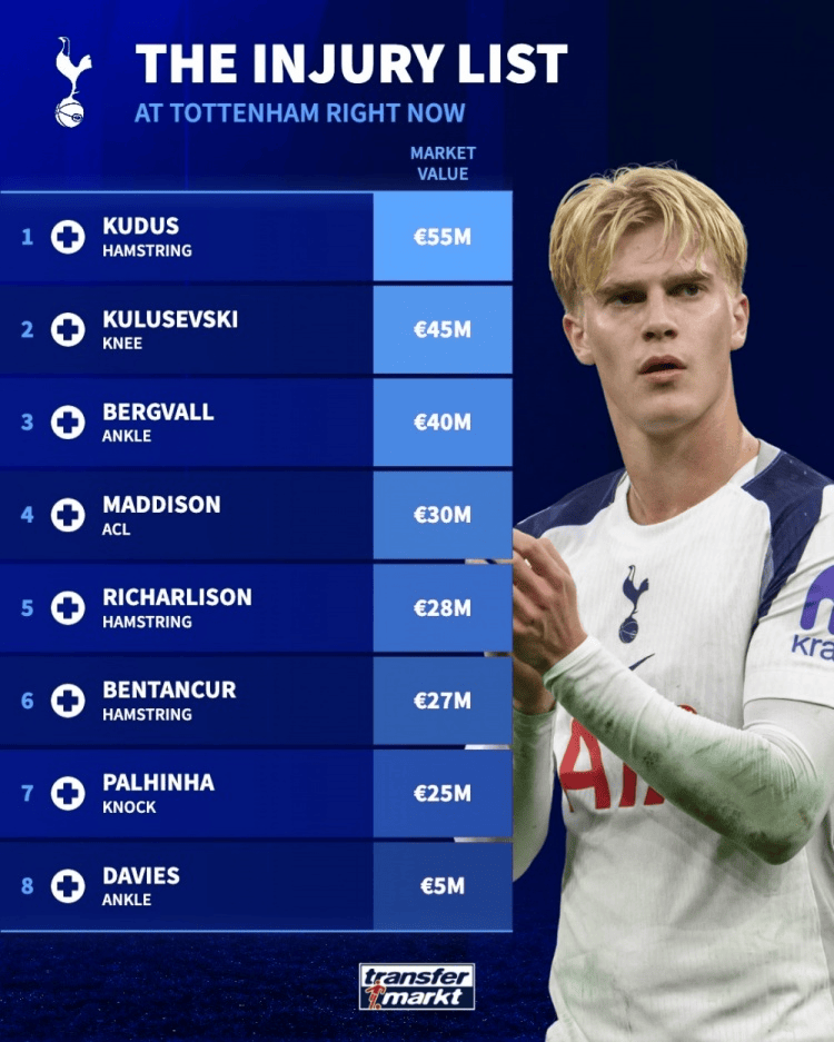 热刺队内伤员身价:库杜斯55M欧居首,库卢、贝里瓦尔前三