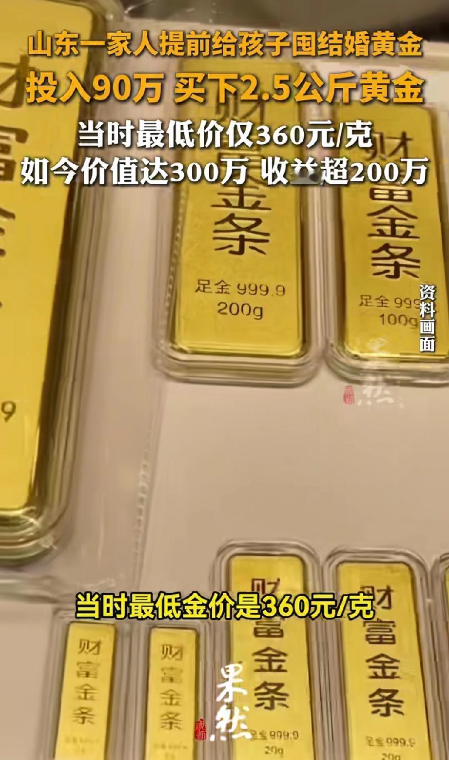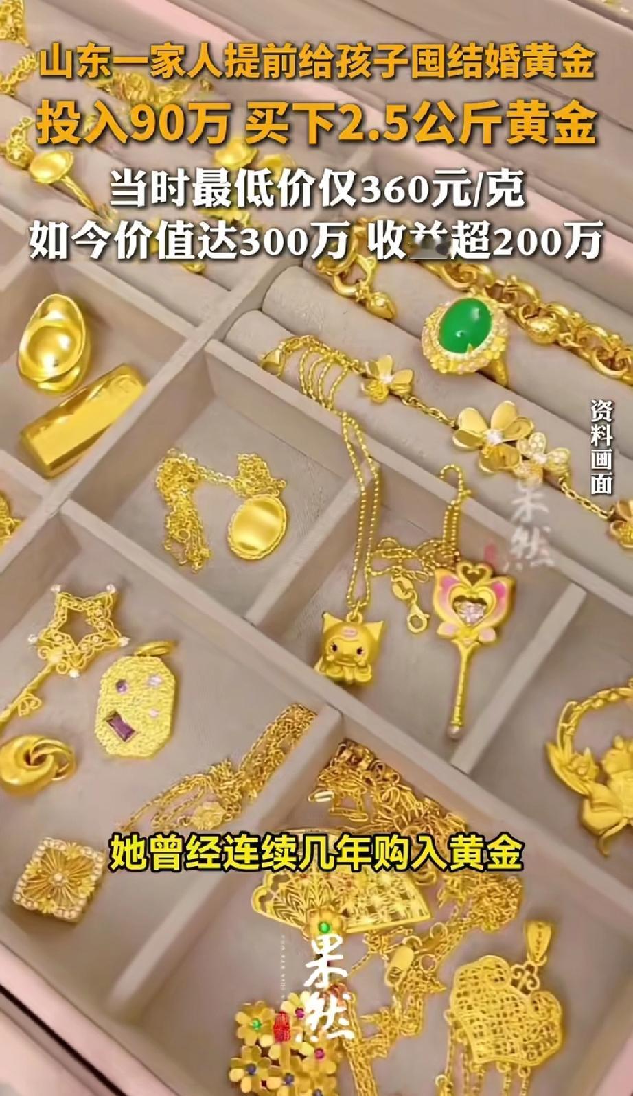 这就是命啊!山东潍坊,一对夫妻为了两个孩子以后结婚,提前买黄金囤着,这些年陆陆续续投资了90万左右,结果金价持续上涨,现在预估收益竟然达到了200万,不过妻子却表示:不论涨多少都不会出手。网友:该出手就出手! 黄女士回忆,当初金价才三百多一克,他们就一点点买,金王冠、沉甸甸的手镯,还有压箱底的金条,前前后后花了90万,攒下五百多克首饰、两公斤多金条。 谁料到金价一路飙升,现在有人帮忙算了笔账,这些黄金市场价差不多有三百万,相当于净赚了两百万。 周围人都羡慕地劝他们趁高价卖掉,可黄女士很平静,她说这不是用来炒的,是给孩子准备的结婚礼,是早就定下的心意。金价涨了是惊喜,但这礼物本身的意义,比价钱重要太多。 这哪是黄金,这是父母沉甸甸的爱啊!这对夫妻太通透了!现在好多人投资就盯着涨跌,追涨杀跌最后白忙活。 可他们从一开始就不是为了赚钱,就想着给孩子留份结婚礼,结果不仅守住了这份心意,还意外赚了钱。 这种把情感和长远打算放在第一位的态度,真的比那些只看短期利益的做法强太多,看着就让人觉得暖心! 金价未来是涨是跌没人能打包票,但这份父母提前多年就开始准备的结婚礼,等孩子成家那天拿到手,感受到的肯定不只是黄金的价值,更是父母跨越岁月的爱。 有时候,用长远的眼光、带着情感去对待一件事,短期的涨跌就真的没那么重要了。这对夫妻的选择,也提醒我们别光盯着眼前的利益,多看看那些藏在事物背后的珍贵意义。
