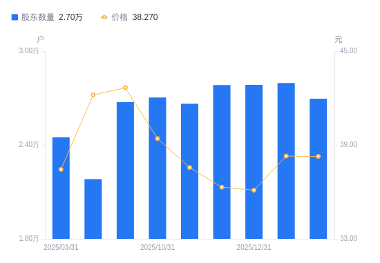日期A股户数(户)流通A股户均持股数(股)户均持股市值(万元)2026-01-20269577618.6729.162026-01-10279617345.1028.122025-12-31278407377.0226.642025-12-20278307379.6826.792025-11-30266397683.5928.862025-10-31270287573.0029.852025-09-30267347656.2832.662025-06-30218169373.7639.562025-03-31244908350.2731.262024-12-31221189245.7733.93