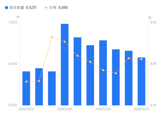 日期A股户数(户)流通A股户均持股数(股)户均持股市值(万元)2026-01-206524821379.9119.012026-01-096654920961.9418.682025-12-316682220876.3018.002025-12-196856220346.4917.662025-12-106762520628.4118.242025-11-286913220178.7418.082025-11-207174319444.3517.952025-11-106255222301.3920.782025-10-316317522081.4618.702025-10-206256122298.0618.86