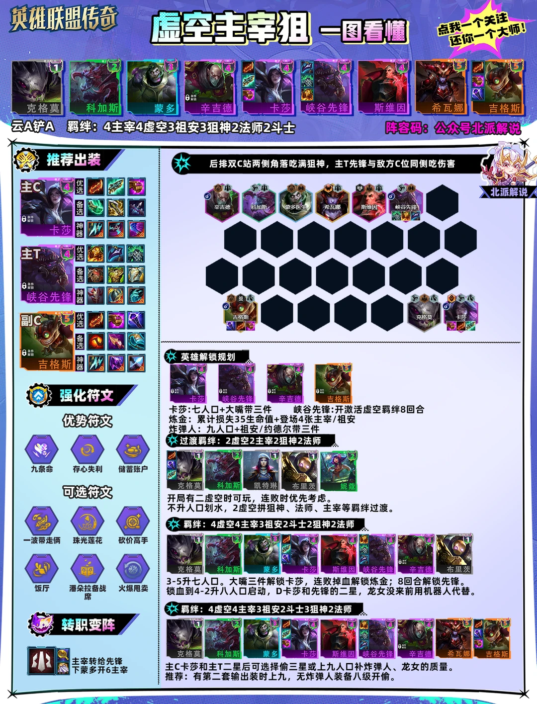 组成羁绊: 4主宰4虚空3祖安3狙神2法师2斗士