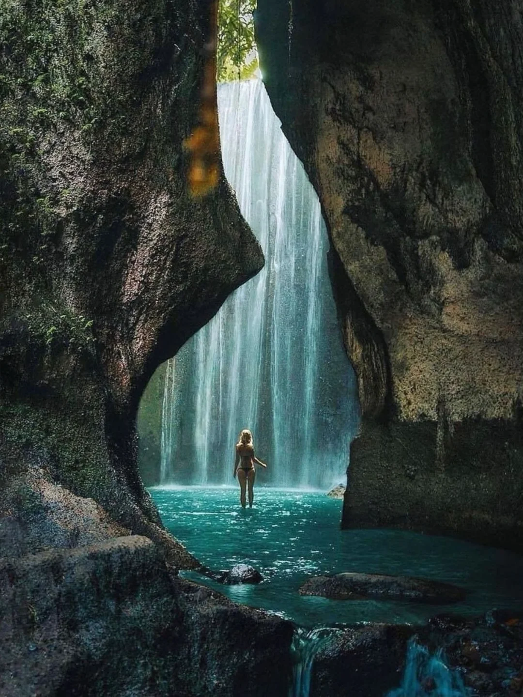 🧚TukadCepungWaterfall:隐匿于丛林洞穴之中的绝美瀑布,阳光穿透薄雾倾泻而下,藤蔓攀附在岩壁上,景色如梦似幻。如果你想想静静地体验这份奇妙,一定要在早上9点之前抵达