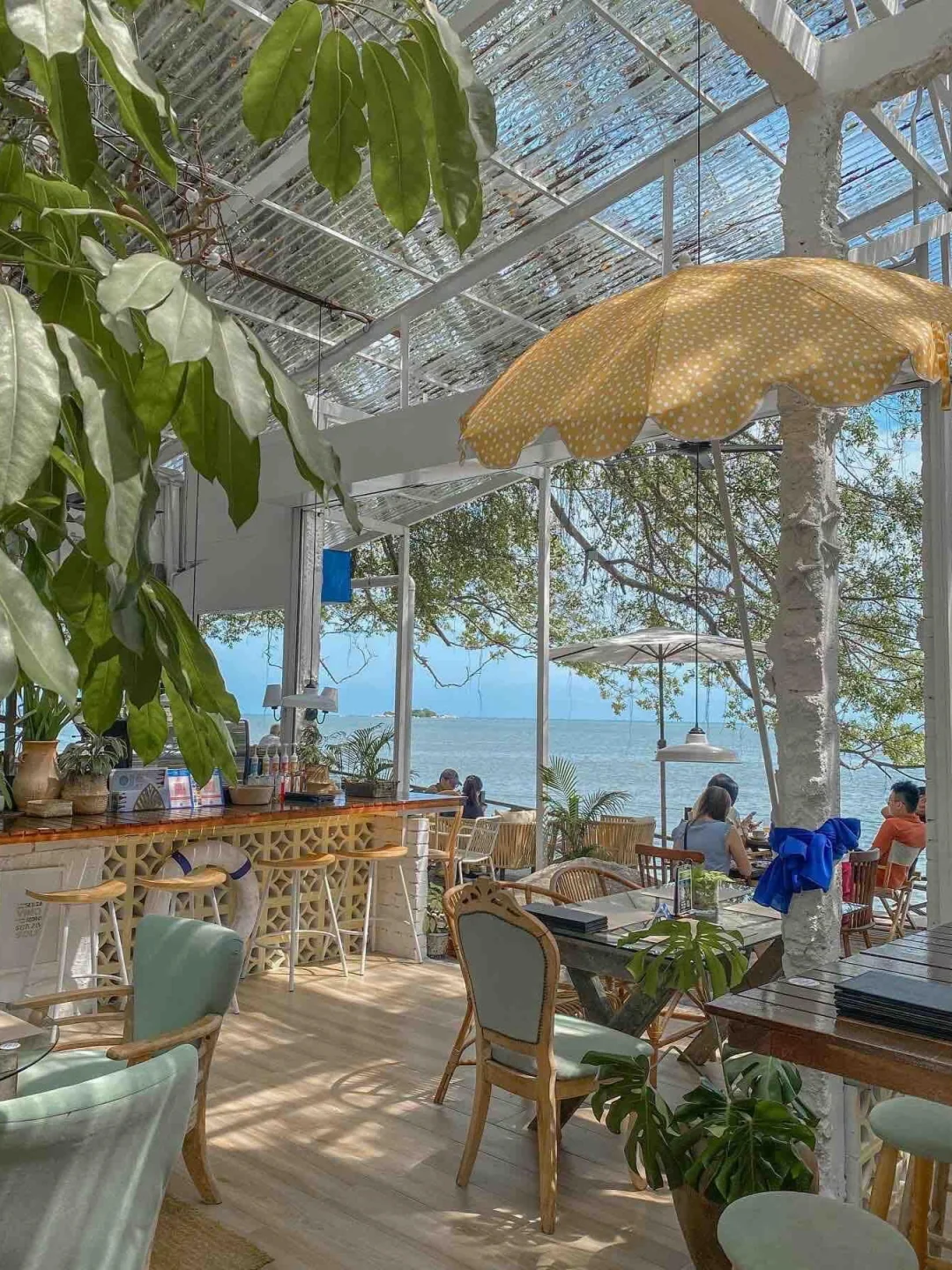 ·这家就在海边,被绿色植物包围,户外座位都可以看到大海