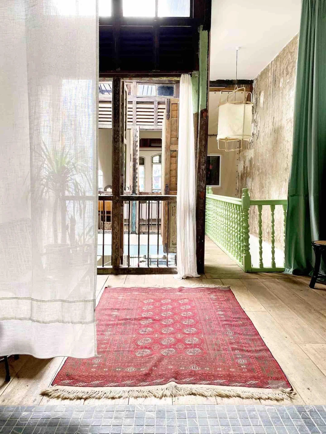 ·抬头是高高的天井,周围是复古的装饰和很多绿色植物