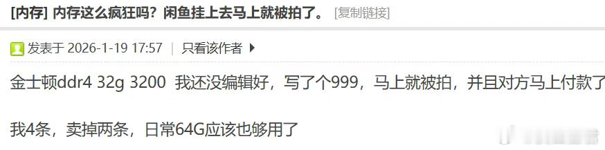 超级周期太猛了。。这段时间很有意思的一件事,就是伴随着存储芯片继续涨价,不管是汽车、电脑还是手机大厂,都在告诉消费者。如果对这类电子产品有需要的话,可以早点入手了。因为后面大部分消费电子产品,可能都要涨价了。因为在AI上游,不断扩大资本开支的的需求提升效应下,存储目前已经进入到超级周期。当然在存储芯片进入到超级周期之后,成本上涨和价格传导,自然也会拓展到消费电子领域。所以我们如果观察芯片(159995)这类行业基金的成分公司,会发现过去几个季度的营收和业绩增速也不错。这里面的原因也不复杂,在AI上游不断增加资本开支提振需求,以及关键领域持续推进的大背景下。从行业ETF的走势也能看出,整个行业从2023年四季度以来,已经逐步进入到景气复苏周期,并且维持到现在。这段时间半导体行业的景气和需求,甚至已经传导到CPU这块的需求增量上。根据KeyBanc的数据,Intel和AMD为应对供需失衡并确保后续供应稳定,已经准备开始上调CPU价格了。在服务器CPU价格上调10-15%的同时,头部的CPU公司Intel和AMD已经表示,2026年的服务器CPU产能已经基本预售完毕。而且伴随着AI的发展,主要应用于AI芯片模块的高带宽内存(HBM)需求也在不断提升。从目前的情况看,存储芯片行业只要上游的AI资本开支不停,需求的高增长和景气度依然会持续维持。因为上游的巨头依然在不断烧钱押注AI数据中心,这部分需求依然还会继续向下游传导。覆盖芯片产业中材料、设备、设计、制造、封装和测试的龙头企业的芯片(159995),依然是值得多加关注的。虽然之前我们已经在一年多之前对存储和芯片的《涨价潮又来了》有过预判,但确实没想到这个超级周期这么猛。很有意思的是,昨天看了个帖子说有个人2023年因为要攒电脑,买了400G的内存。当时这哥们花了一万多,现在在闲鱼上卖掉可以卖六万多,而且买家买到手还有的赚。你去看各种论坛也会发现,有人在问现在内存条这么疯狂么,在海鲜市场挂上去马上就被拍了。我看看了存储现货的短期涨势确实也是很猛,尤其是最近两三个月都是成倍上涨。2025年11月底那时候,能1000元的DDR5内存条,现在价格已经涨到了2500元。如果你想组装电脑的话,因为内存涨价同等配置的电脑,之前组装可能需要花1万元,现在要1.25万元。涨价的原因也很简单,上游存储的产能就这么多,现在大部分需求都被AI拿走了不管是存储厂还是芯片厂,肯定是把产能优先供应能给更好价格的AI领域。这样能留给终端消费电子的产能就很有限,但是消费电子市场的整体需求还在,价格大幅上涨就是必然。不少专门从事电脑组装的厂商负责人都在感叹,自己从业30多年从没见过存储这种拉涨的态势。这轮价格上涨是从9月份开始的,而且这几个月的涨速确实是快的惊人。市面上最常见的DDR5 16GB内存条,2025年9月15日前,价格也就300元左右。到了2026年1月,这个价格已经涨到了1200元至1400元,基本上就是三四倍的涨幅。原本卖200元的DDR4内存条,现在买的话差不多要花六七百元,也涨了三倍多。这就意味着在其他配置不变的情况下,买一台16GB内存的电脑,成本比几个月前增加了一千多。这样的涨价持续,其实后面不管消费电子类的大厂小厂,涨价就是迟早的事情。大厂类似联想、惠普、戴尔有战略备货的,涨价可能会慢一点,但库存总有用完的的时候,之后就不得不开始涨价了。这轮存储器涨价,主要是受到受到AI算力需求激增影响,资本开支扩大以后需求传导到各个细分领域。现在上游大型科技企业都在扩大资本开支增大算力投入,之前是GPU和光模块,现在是HBM(高带宽存储)。现在存储芯片涨价,就是因为AI高性能存储单元消耗比较多,挤占了消费级的产能,导致了消费电子的价格上涨。而且很有意思的是,现在虽然消费级内存价格在持续上涨,但是美光、海力士等主要内存厂商对扩产十分谨慎。一方面是扩产的周期要3至5年,没有人敢赌后面的价格上涨还会继续持续。另一方面我们也看到,从目前的供需关系看,AI这块的存储器还在加单。再加上上游科技企业的支付能力,比民用消费电子强很多,人家可以给上游生产厂更高的溢价。所以即使我们看到存储这块开始扩产,消费级存储产品也很难和AI抢产能。现在产能需求的短缺,其实已经从存储厂拓展到全产业链上下游的各个配套厂。我们看到伴随着DRAM(动态随机存取存储器,即内存)与NAND Flash(闪存,即硬盘存储)的大厂,全力冲刺出货。下游的封测厂商订单也在不断增加,多数厂商现有的产能已经没办法满足封测的需求。为了应对需求的暴涨,各家封测厂也启动了首轮涨价,涨幅已经达到了三成。这个涨价会在一季度体现在财报中,而且涨价的趋势还在延续,后续可能会开始第二波涨价。现在这些头部封测厂商的产能,也就只能满足大概八成客户需求,不少厂商正在紧急向外采购设备扩充产能。这也会提升半导体设备和封测设备厂商的订单需求,最终把利润反应在设备厂的的财报上。而且虽然我们看到存储和封测都在涨价,但是上游的需求伴随着科技巨头继续扩大资本开支,还在进一步提升。目前三大存储巨头里面,三星电子、SK海力士及美光科技,都在全力扩充AI专用的HBM(高带宽内存)产能。因为存储巨头把资源都集中在先进及封装制程,消费电子用的标准型DRAM与NAND的产出受到同步挤压。这就导致消费电子上用到的存储和