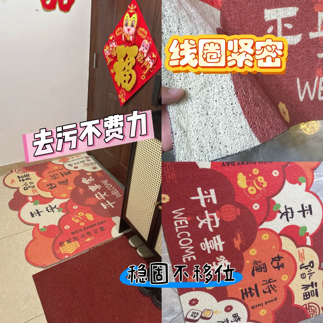 门外,我铺上了春节装饰用的地毯。热烈的“福”字图案,线圈紧密扎实,脚感舒适。它不仅稳稳吸附地面,不易移位,踏上去的那一刻,仿佛完成了一个小小的仪式,向在外的风尘仆仆正式告别。