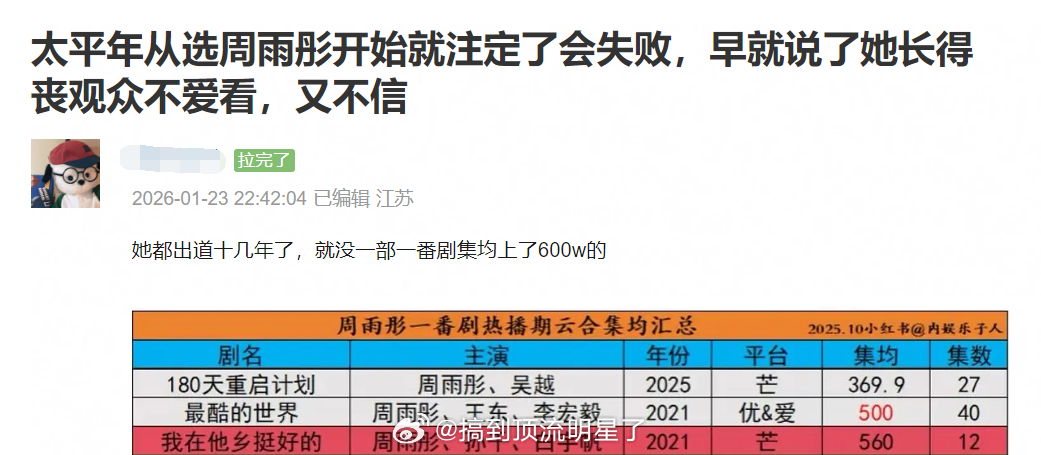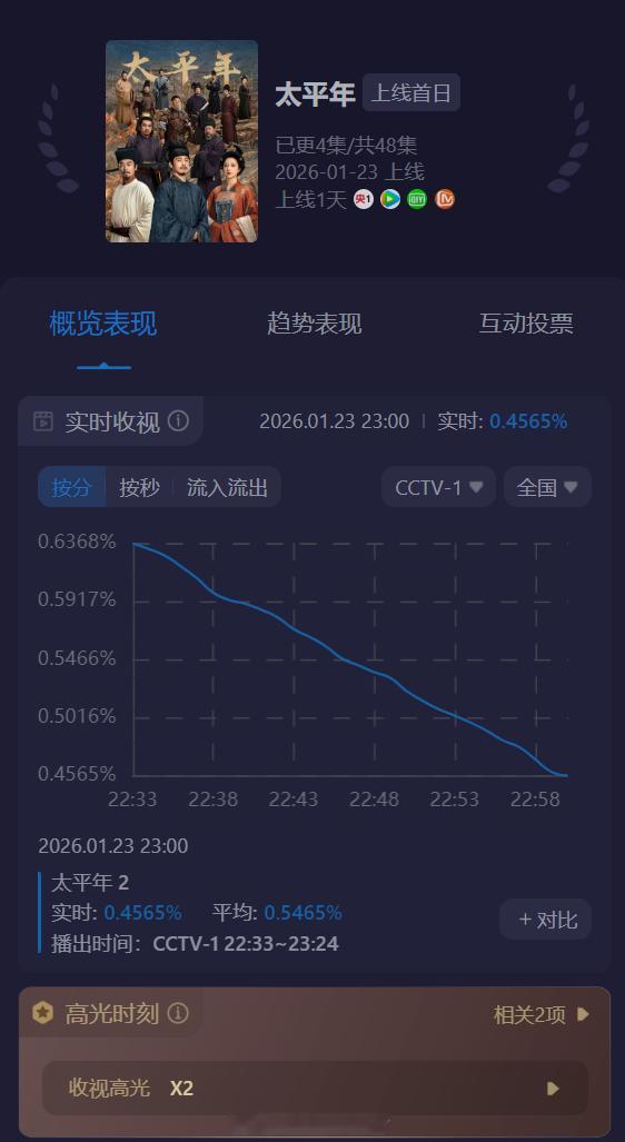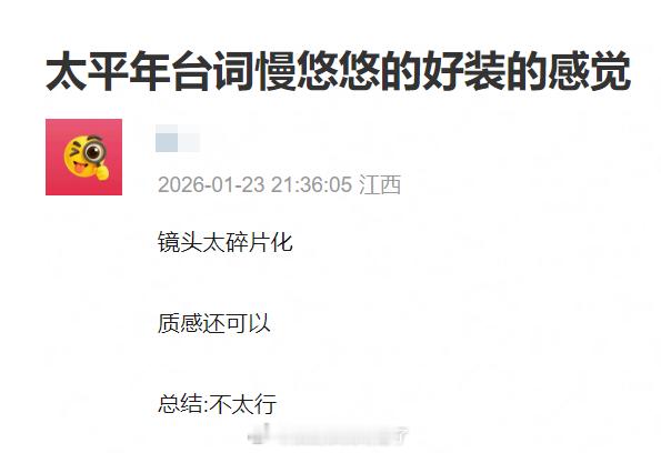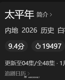 《太平年》首播反馈有点差啊,导演叙事能力差,节奏不行、画面不行,不少观众觉得无聊犯困,听不懂也看不懂,周雨彤也劝退。上星收视不行一路下滑,酷云收视率跌破0.5了,网播热度不行爱奇艺4300+,腾讯还没破20000 太平年 吃人 太平年尺度