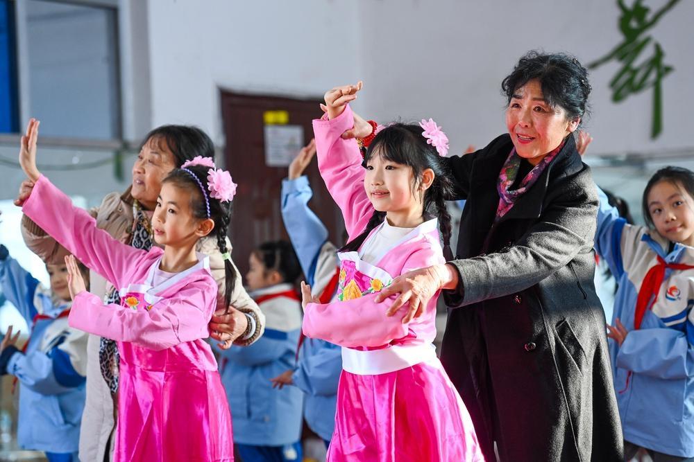 宜春市第六小学戏曲社团的学生在戏曲老师的指导下练习采茶戏基本功。