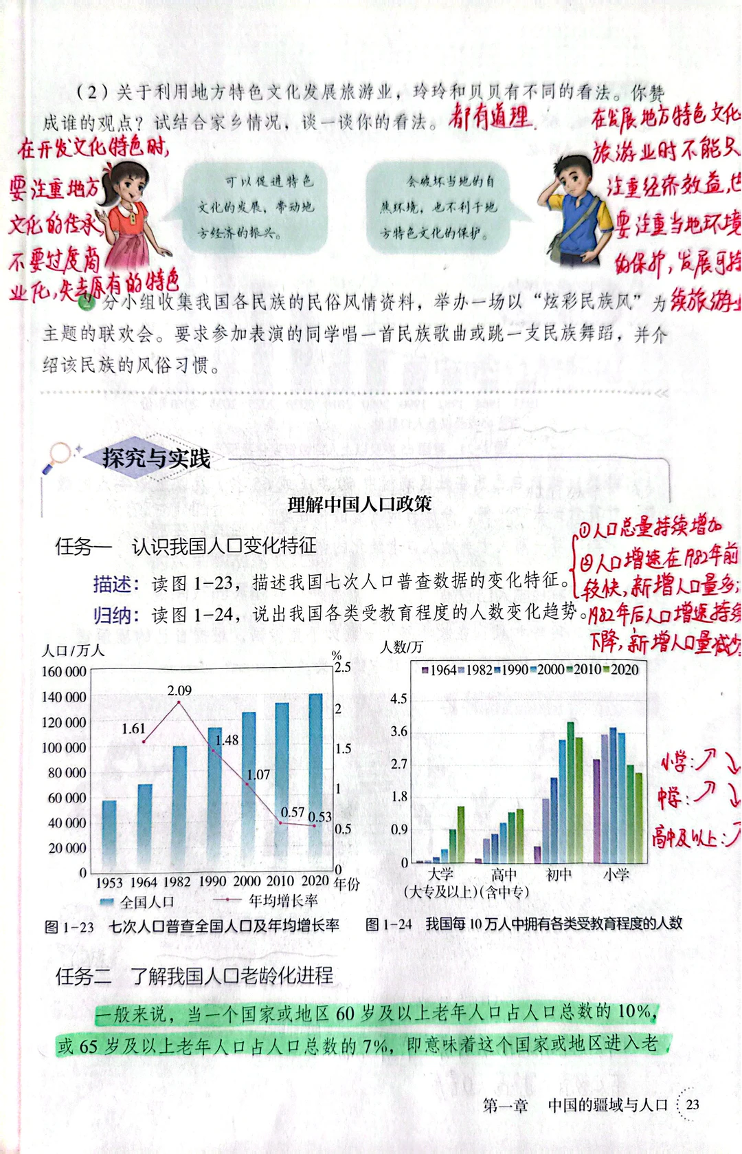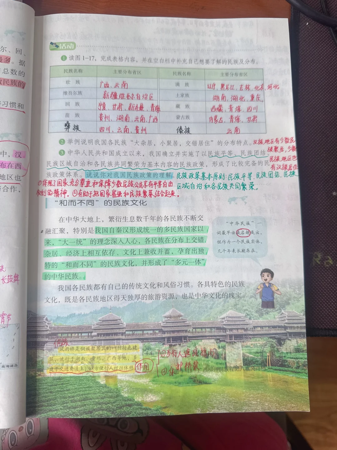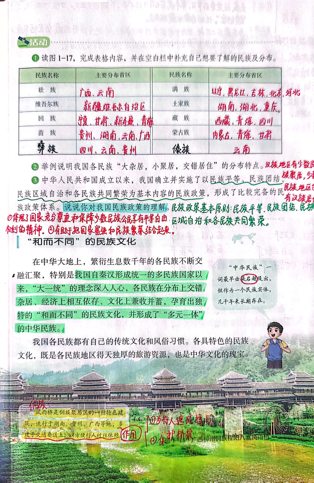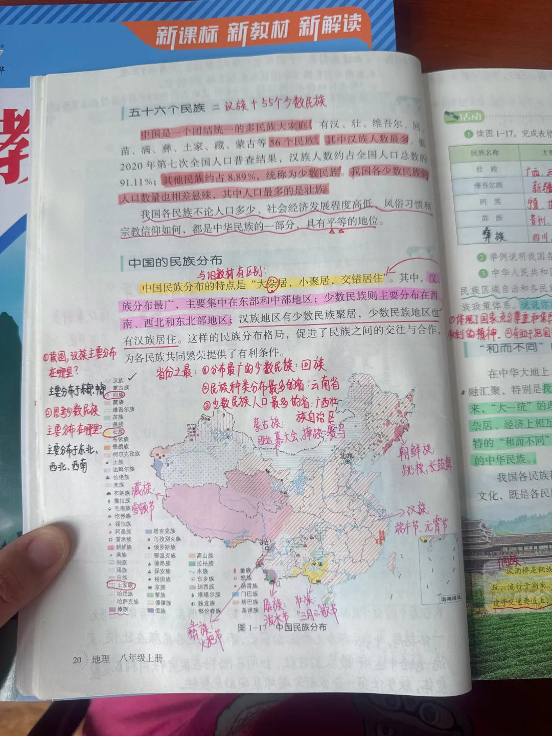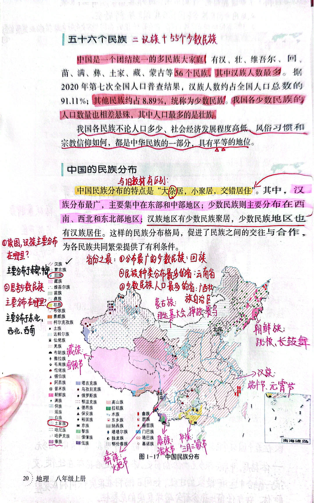 [星R]民族这节内容变动不多,删减了一些人数少的少数民族 [向右R]旧教材是"大散居,小聚居,交错杂居" 现在改成"大杂居,小聚居,交错居住” 这部分考试喜欢结合民居聚落来考,后面探究与实践也比较结合实事,让学生学会识图析图。