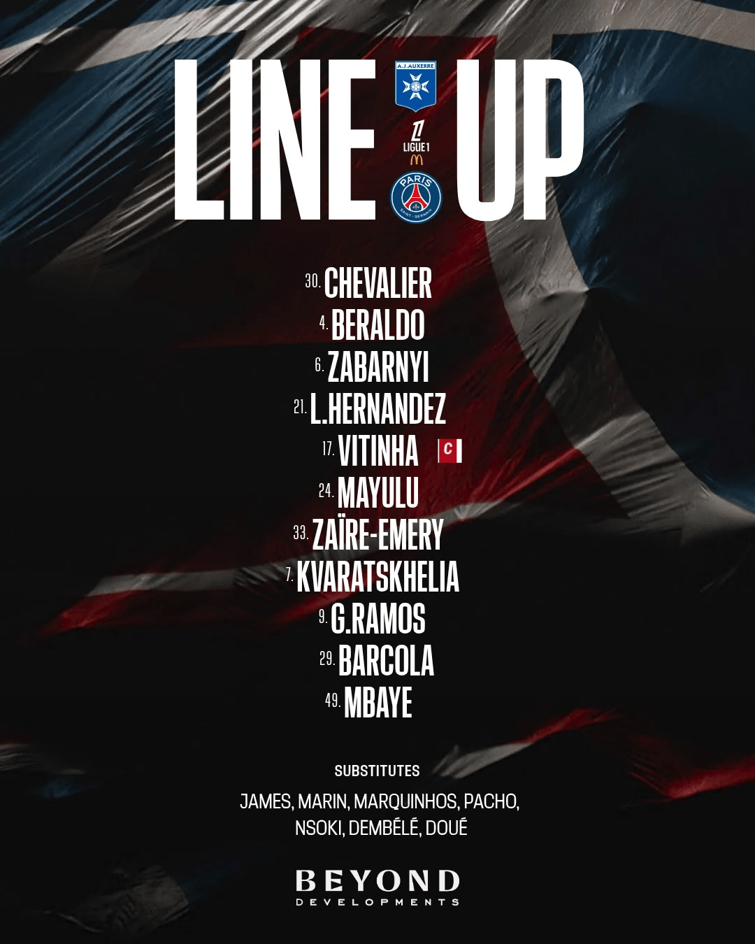 巴黎首发:30-舍瓦利耶、33-扎伊尔-埃梅里、6-扎巴尔尼、4-卢卡斯-贝拉尔多、21-卢卡斯-埃尔南德斯、24-马尤卢、17-维蒂尼亚、49-姆巴耶、29-巴尔科拉、9-贡萨洛-拉莫斯、7-克瓦拉茨赫利亚