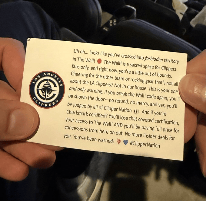 快船工作人员写道:“哎呀……看起来你已经闯入了TheWall!的禁区!TheWall!是只属于快船球迷的神圣区域,而你现在有点越界了。支持客队,或者穿戴任何不是洛杉矶快船相关的装备?在我们这儿可不行。这是你唯一一次警告。如果你再次违反TheWall!的规则,你将被请出场馆——不退款、毫不留情,而且没错,你还会被整个快船国度‘审判’。另外,如果你还是Chuckmark认证会员?那你将失去这项珍贵认证、失去进入TheWall!的资格,并且从此购买场馆餐饮都得按原价支付——再也没有任何内部优惠。你已经被警告了!”