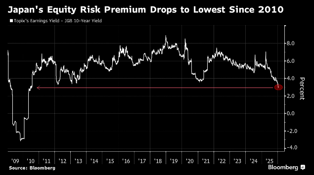 年初以来,市场押注日本首相高市早苗将通过提前大选巩固权力,进而扩大财政支出,受此提振,日本股市大幅走高。然而在周二,这波被称为“高市交易”的行情宣告崩盘。债券市场暴跌导致收益率飙升至历史新高,带动日经东证股价指数(Topix)连续两日下跌。在2月8日大选临近、市场情绪依旧脆弱的背景下,股市投资者认为有必要保持警惕。债券收益率走高可能对股市造成冲击:一方面会降低股票对投资者的相对吸引力,另一方面也会令持有大量债券的日本本土银行和保险公司面临减值损失风险。道富投资管理公司指出,若10年期国债收益率突破2.5%、超长期国债收益率逼近4.5%,股市或将面临资金分流压力。数据显示,本周日本股市风险溢价(即投资者持有股票相对国债所要求的额外回报)已收窄至3%以下,创下2010年以来的最低水平。