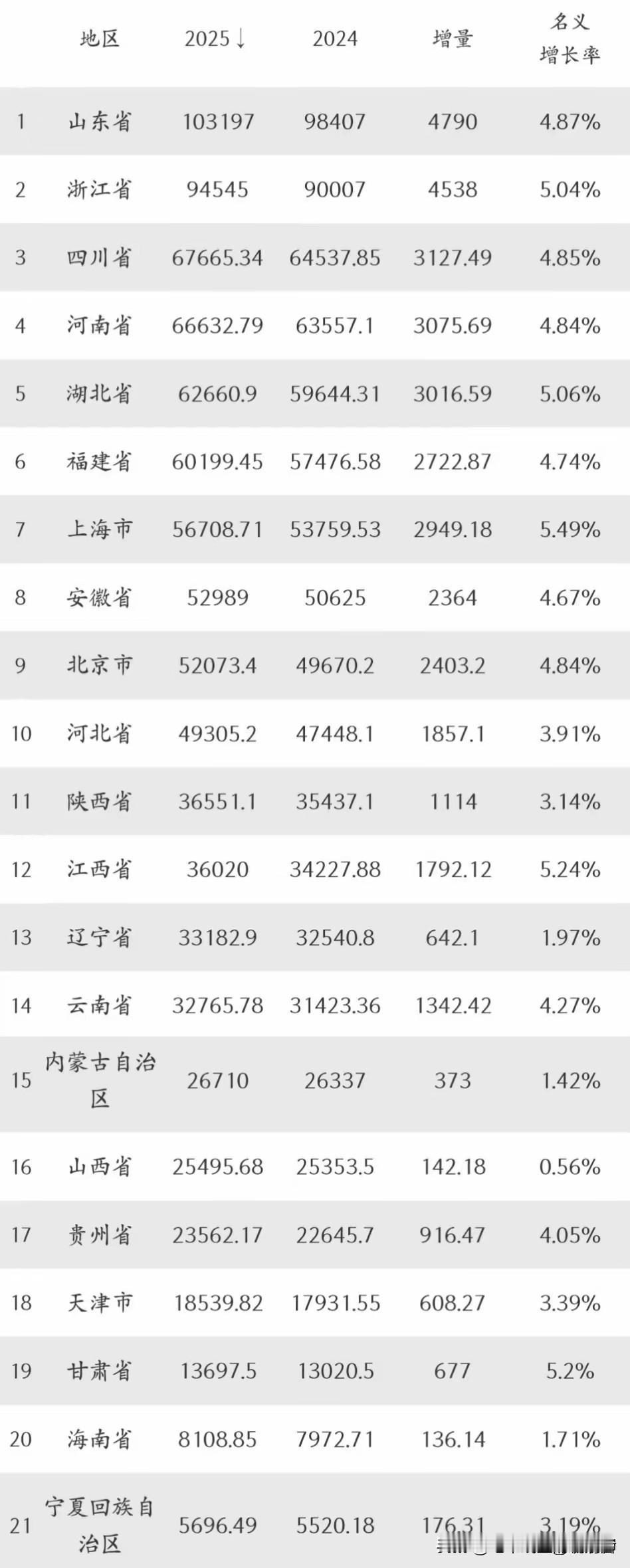21省2025年GDP公布,安徽当仁不让 截至23日,已有21个省份公布了各自2025年的成绩单。其中,安徽2025年GDP数据也已公布,总量52989亿元,同比增长5.5%,绝对增量2364亿元,名义增速4.67%。 2025年, 安徽这样的成绩,在大部分人的预料之中。同时,在安徽成绩未公布之前,也有人曾预料安徽今年要被北京超越。现在,北京、安徽都已公布了,安徽的同比增速、名义增速、绝对增量均碾压北京,事实是,安徽甩开北京的距离增大了。安徽为什么能行?看看其5.9%的二产增速,看看其第一汽车生产大省的头衔、工业营销全国第五的实绩就明白了。