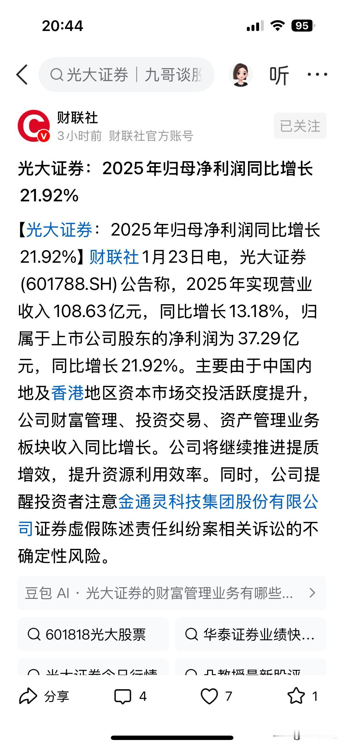 光大证券净利37亿元,同比增长21.92%,这净利润增速都比不过庞然大物中信证券38.46%,这不是明显的拖了证券板块整体增速的后腿? 光大证券市盈率超过20倍,愈发凸显了中信证券不到14倍的含金量。 当然中型券商确实也相对难些,在牛市小券商股靠自营业务赚钱,大型券商靠规模经营发展,而中型券商的路径估计只能靠并购先做大再谈。 光大证券即使上千亿市值,凭借目前的盈利能力肯定有所欠缺。 乐呀财经