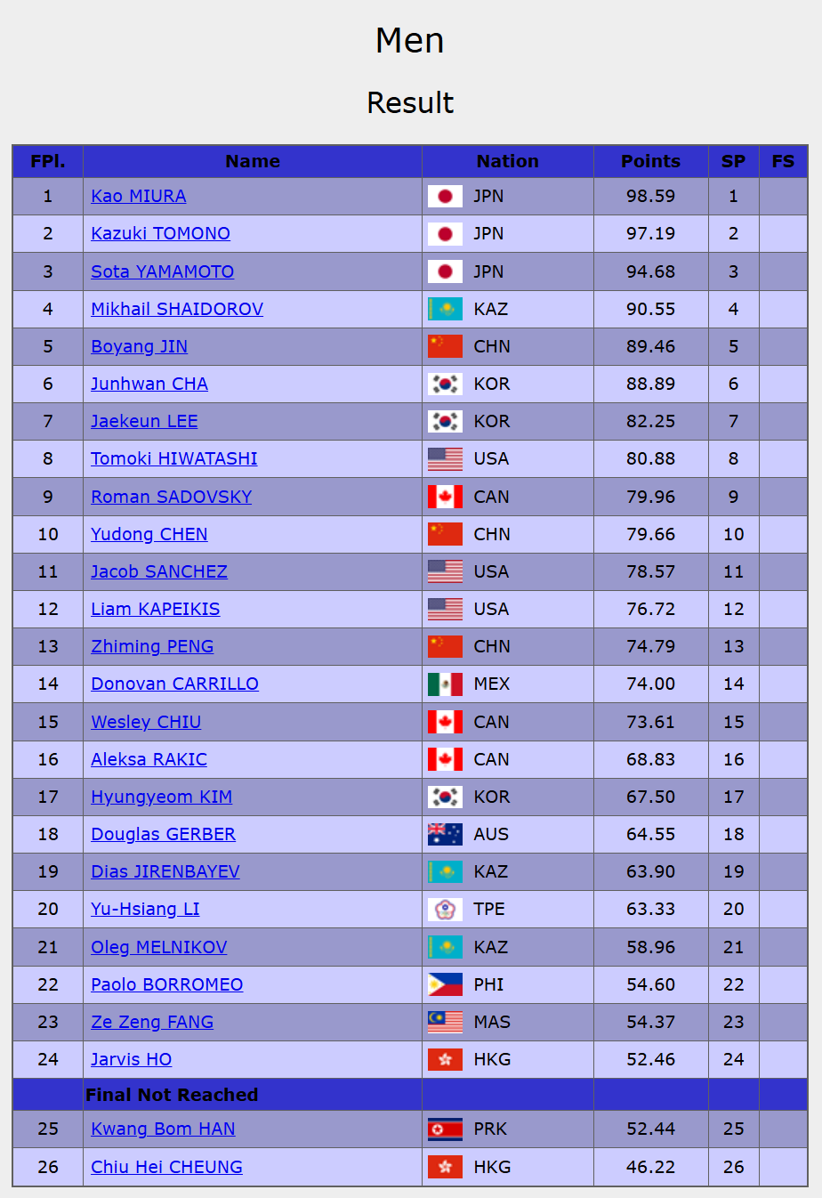 日本选手三浦佳生高质量完成了后内结环四周连跳、后内点冰四周跳和阿克塞尔三周跳,以98.59分获得短节目第一;另外两位日本选手友野一希和山本草台分列2、3位。
