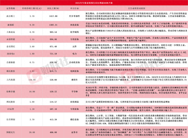 具体到个股来看,南方精工以最高1417%的业绩增速暂时领跑。1月21日,南方精工公告称,预计2025年归母净利润3亿元–3.7亿元,同比增长1130%-1417%。报告期内,公司对持有的江苏泛亚微透科技股份有限公司等投资项目进行公允价值评估,产生非经常性损益性质的公允价值变动收益约3亿元至3.2亿元。