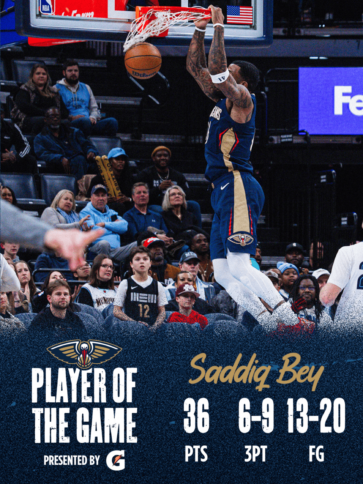 本场比赛,鹈鹕球员萨迪克-贝出战31分钟,20投13中,其中三分球9投6中,罚球4投4中,得到36分4篮板4助攻1抢断。