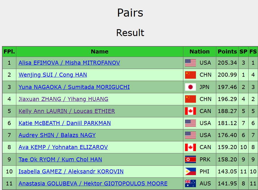 美国组合叶菲莫娃/米特罗法诺夫摘得金牌,日本组合长冈柚奈/森口澄仕获得季军。