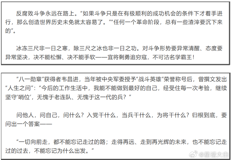 该文第二段落则重点讲了反腐。其中提到:“腐败是我们党面临的最大威胁,反腐败是最彻底的自我革命”“军中绝不能有腐败分子藏身之地”“没有免罪‘丹书铁券’,没有‘铁帽子王’””还提到“坚持无禁区、全覆盖、零容忍,坚持重遏制、强高压、长震慑,坚持有案必查、有腐必惩。”还提到了:“当反腐败斗争行至新的关口,我们需要拨开眼前的一些迷雾,比如盲目乐观的“速胜论”、消极悲观的“无望论”、是非不分的“有害论””。第二段文末则说:“反腐败斗争永远在路上。“如果斗争只是在有极顺利的成功机会的条件下才着手进行,那么创造世界历史未免就太容易了。”“任何一个革命阶段,总有一些渣滓要沉下来的”。“冰冻三尺非一日之寒,除三尺之冰也非一日之功。对斗争形势要异常清醒、态度要异常坚决,决不能松懈、决不能手软——宜将剩勇追穷寇,不可沽名学霸王!”第三段则以“抗美援朝”作为切入点。文末引用“八一勋章”获得者韦昌进发出的“人生之问”:“问他人,问自己,问什么?入党干什么,当兵干什么,为将干什么?归根到底,要问出一个答案:一切向前走,都不能忘记走过的路;走得再远、走到再光辉的未来,也不能忘记走过的过去,不能忘记为什么出发。”这一段话,我个人理解,就是入党、当兵、为将,都要“不忘初心,牢记使命”。忘了初心,就容易失守廉洁阵地。第四段则重点讲了“为将者”。第四段末尾是说:“见百金而色变者,不可统三军。自古以来,军队高级将领要坚守的阵地,不仅有战场的阵地,还有廉洁的阵地。廉洁的阵地一旦失守,危害不亚于丧师失地。”