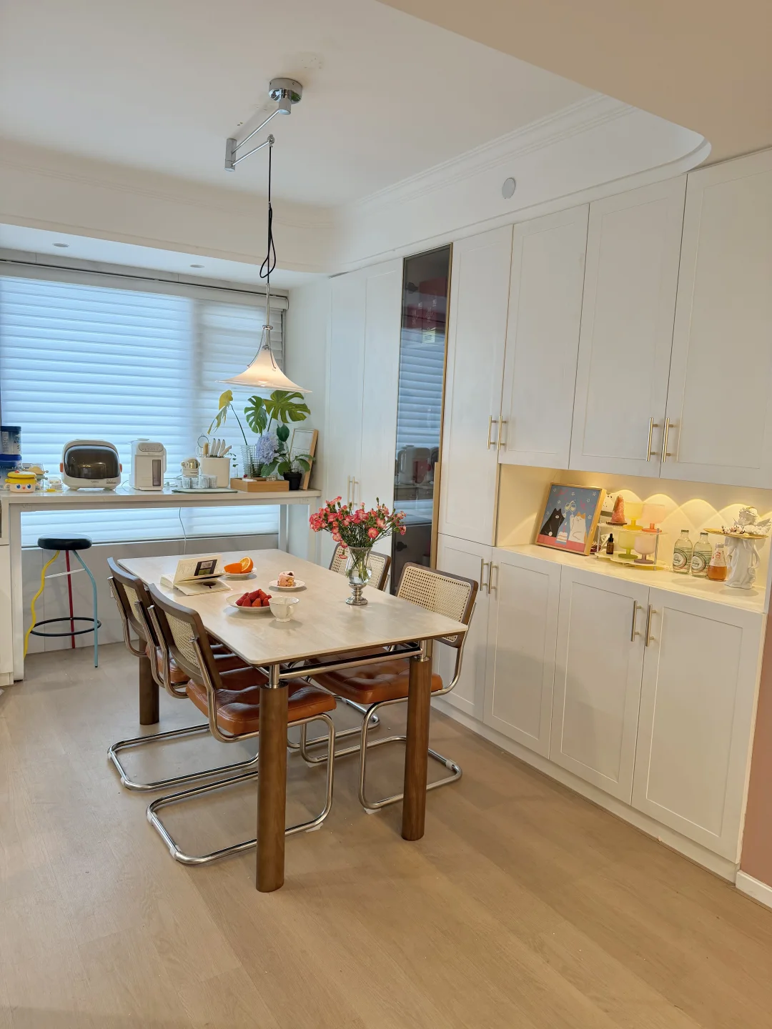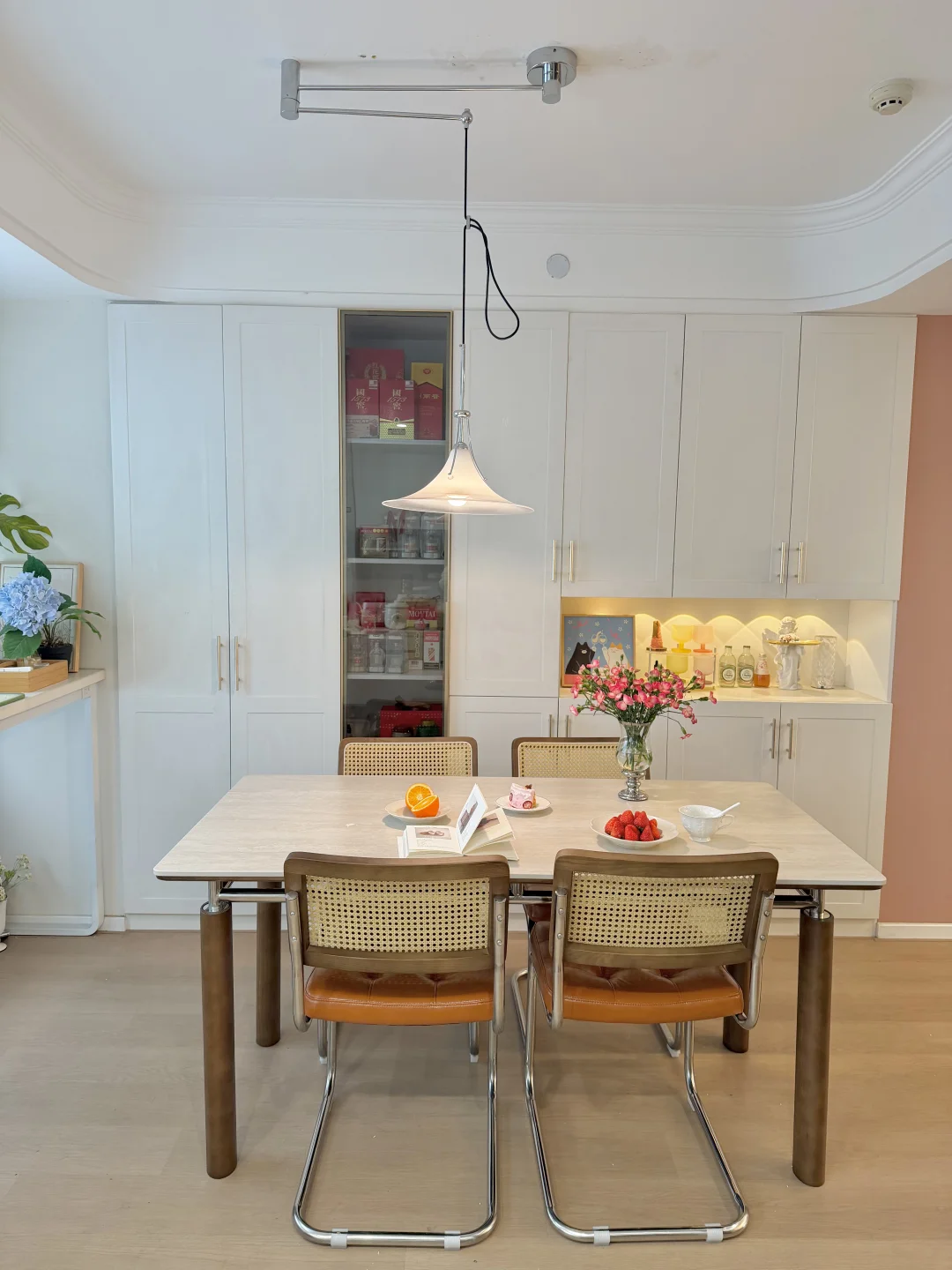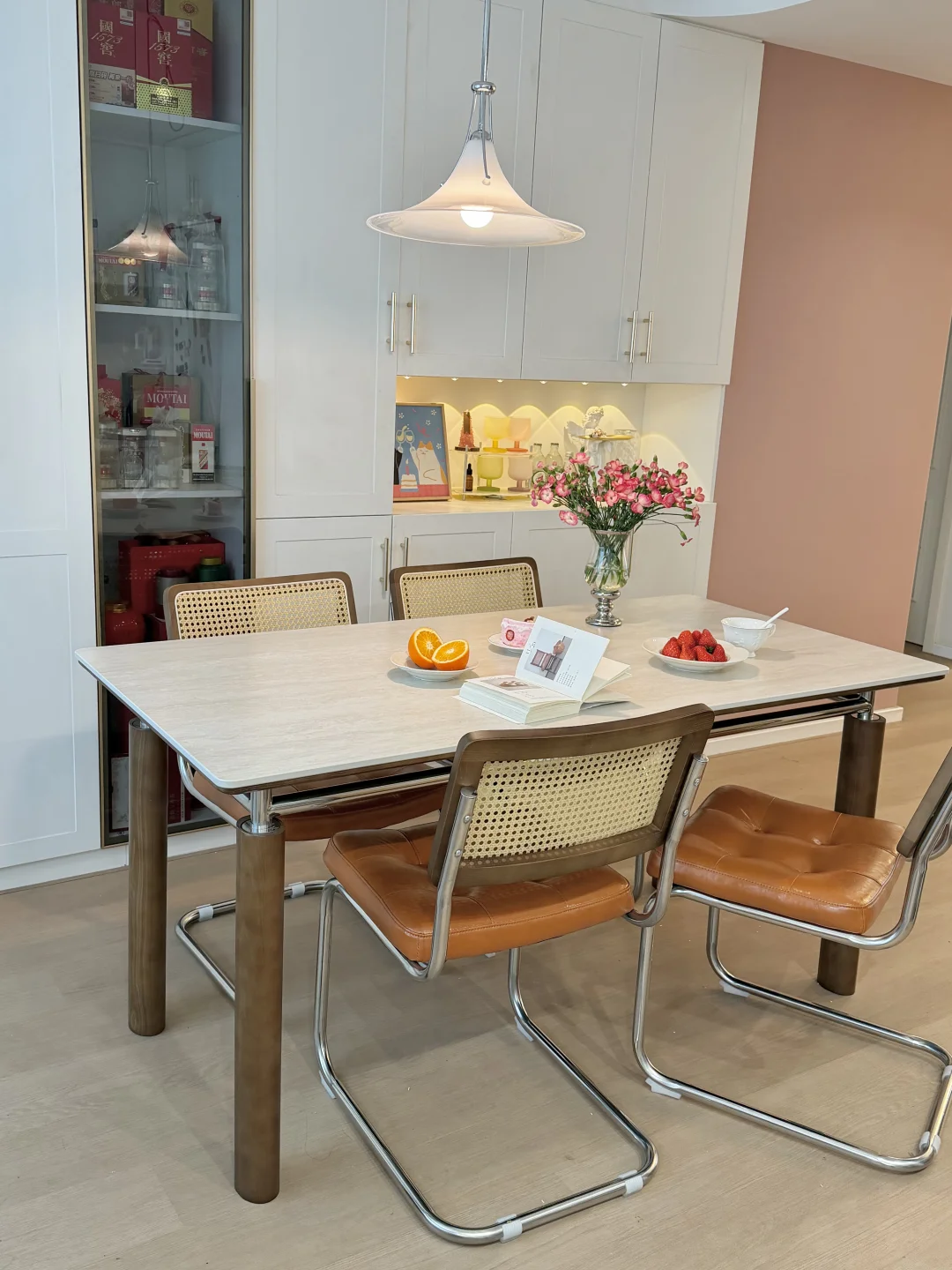 我家餐厅长2.87m,餐桌选的是160×80巴洛摩卡四季餐桌,作为一枚妥妥的颜值党,一眼就爱上这张中古风岩板餐桌的质感
