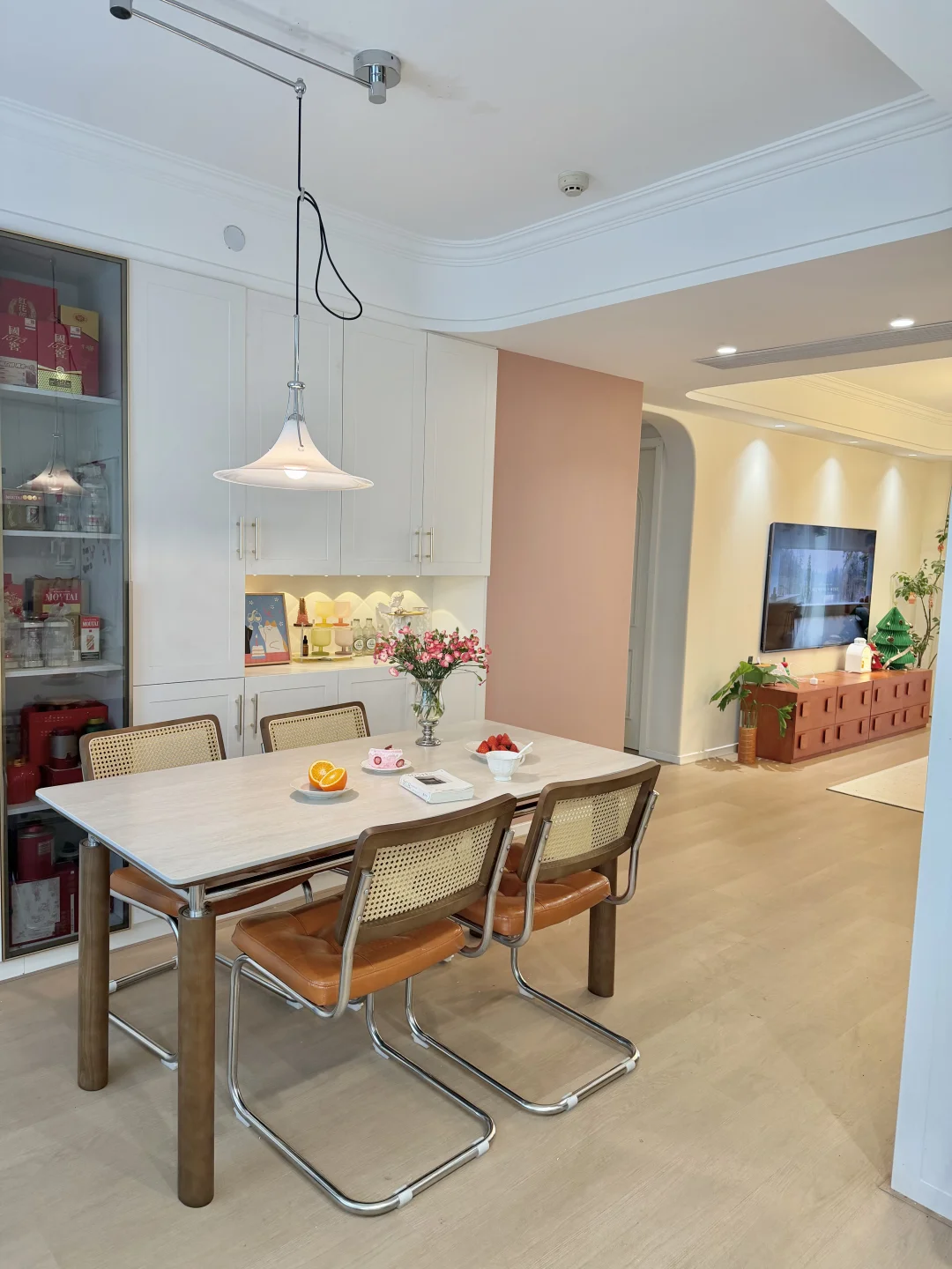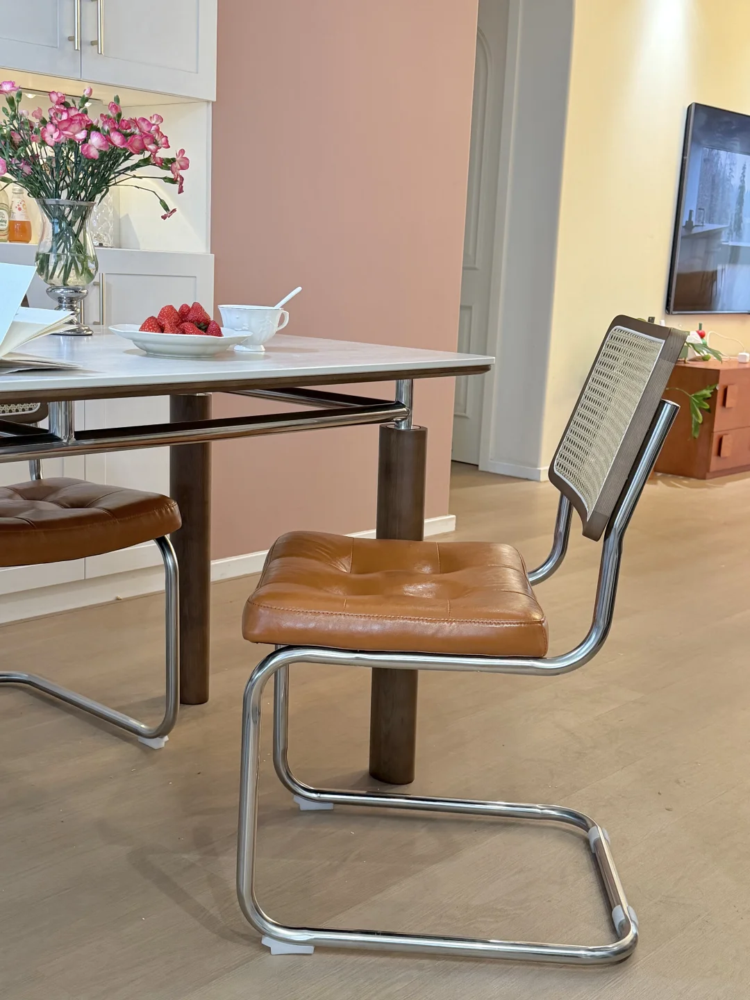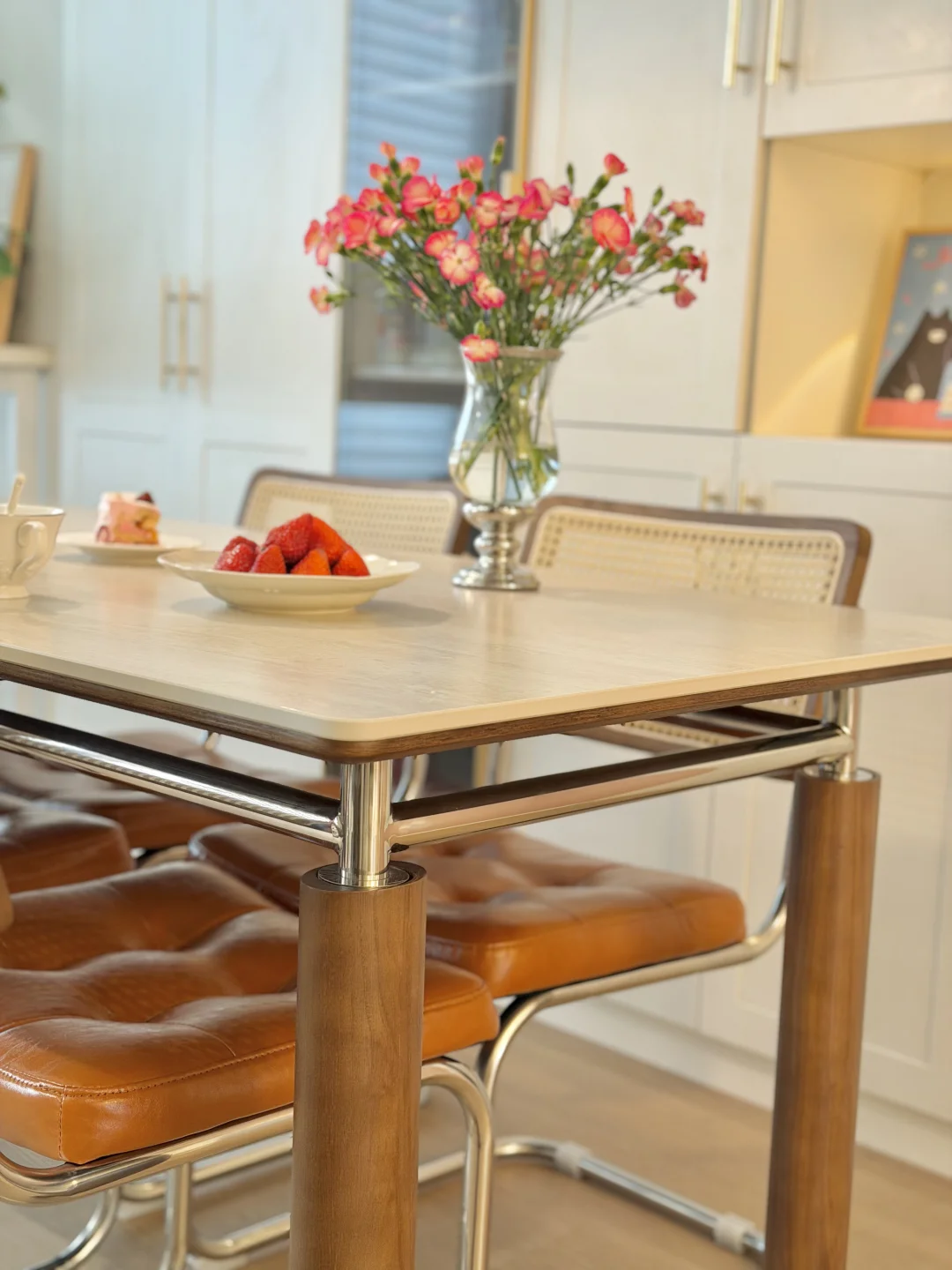 桌腿是白蜡木搭配不锈钢一体框架,桌边还做了圆弧设计,再也不怕小朋友跑跑跳跳磕碰到,刷的是嘉宝莉环保漆,拆开的时候没有一点味道很环保,有娃家庭也可以安心用。搭配的藤编靠背餐椅也舒适透气,一家人唠嗑久坐都不会累,和餐桌搭配一套复古耐看
