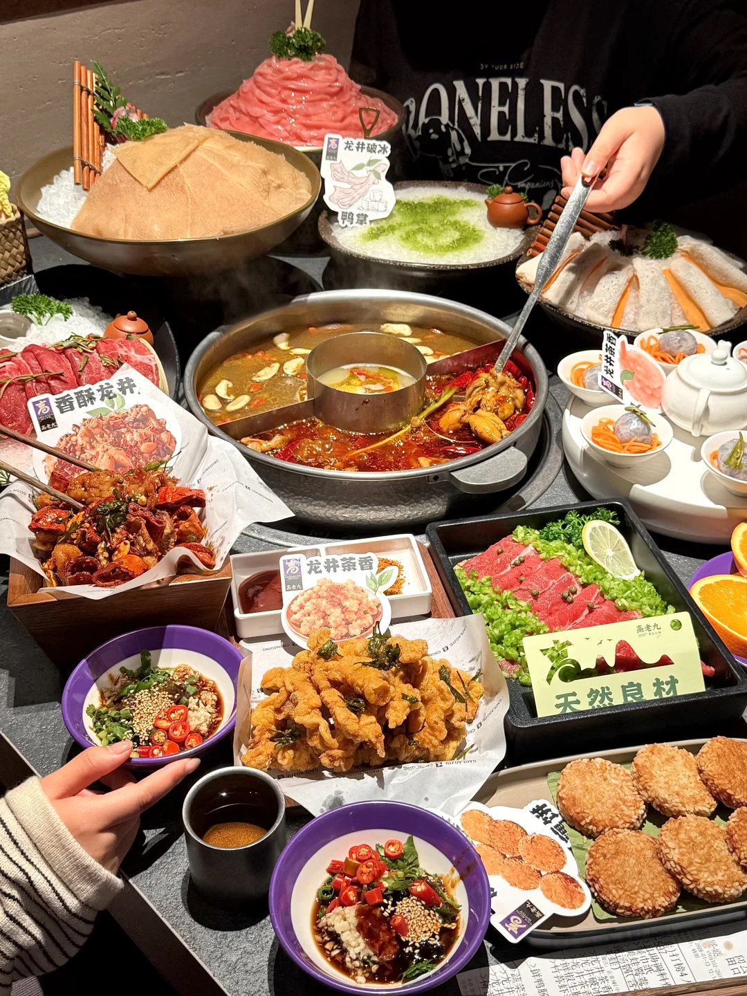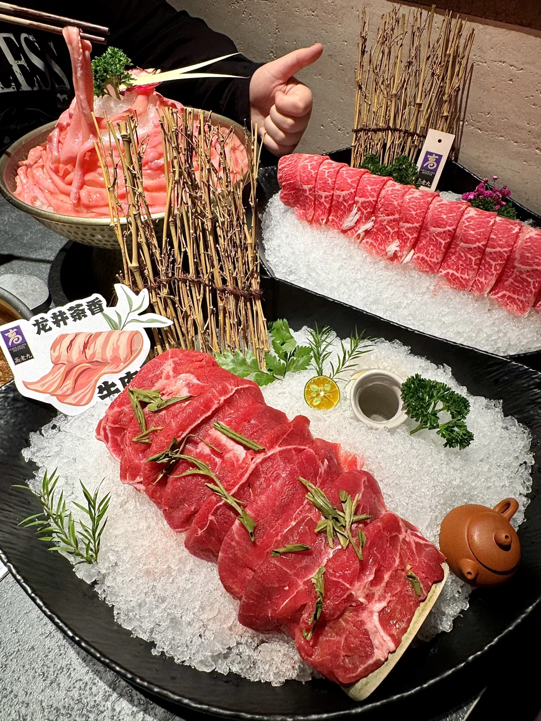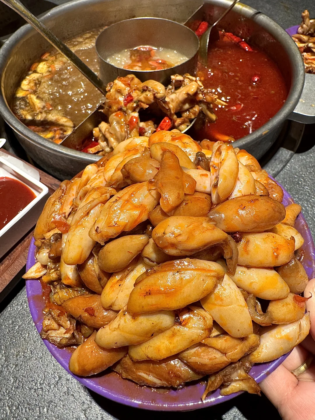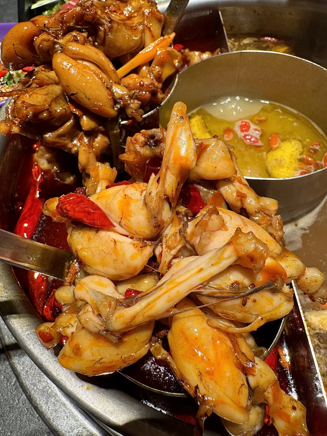 每个人调的蘸料都不一样。。。但和美蛙的适配程度都是100昏😭!! 就在西湖边!!和朋友连吃三天了!牛蛙真的巨嫩巨好吃 越煮越辣很带劲!锅底牛油香四溢,煮久了也不苦!我们点了龙井系列:虾滑、牛蛙、鸭掌…随便涮涮都不踩雷!真心吊打那些网红店了!叫:高老九)