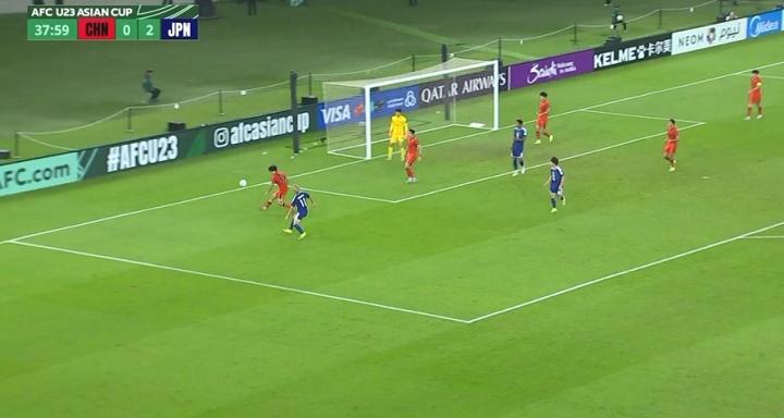 比赛第39分钟,日本U23传中至后点,杨希将球停出底线