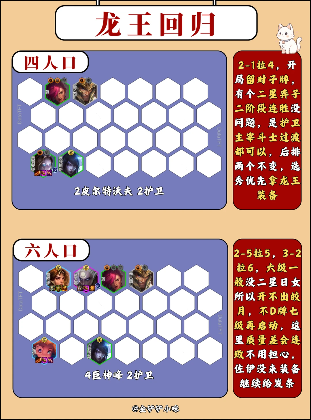 4️⃣阶段4-2左右得有龙王,龙王出来后无脑卡利息拉等级,没血量就八级找四费卡全二星,有血量直奔九找二星龙王