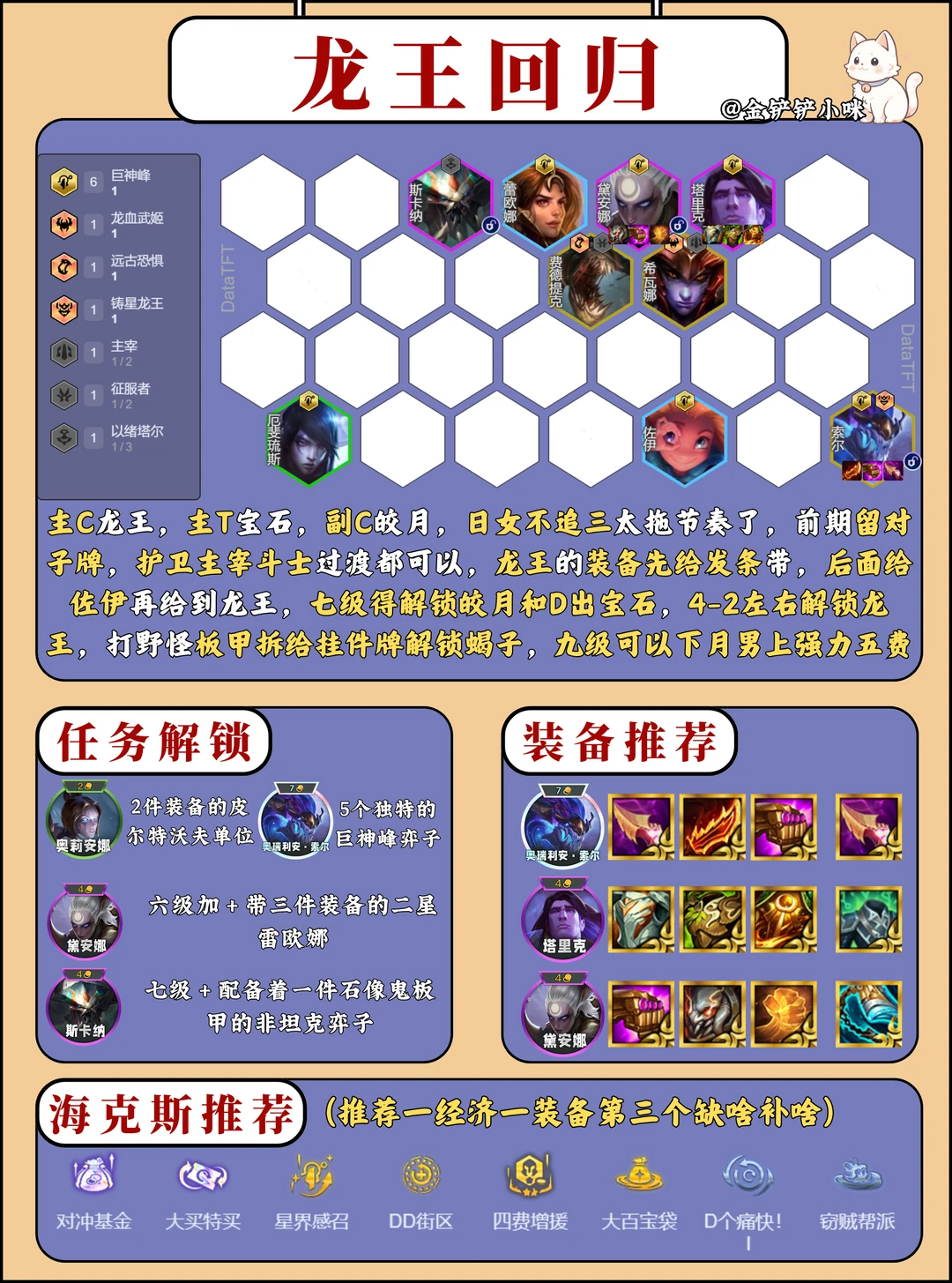 🔴解锁任务(中译中):发条(2件装备的皮尔特沃夫单位) 皎月(六级加+带三件装备的二星雷欧娜) 蝎子(七级+配备着一件石像鬼板甲的非坦克弈子) 龙王(5个独特的巨神峰弈子)